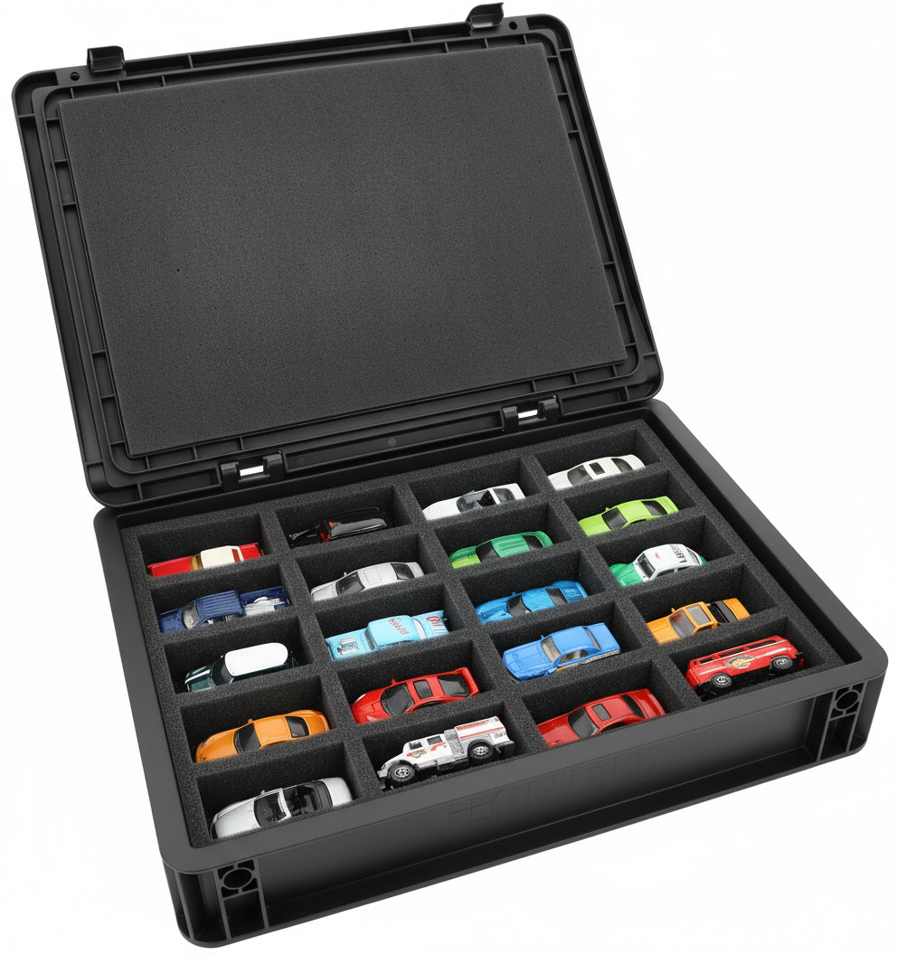 • Passgenaue Schaumstoffeinlage mit 20 Fächern für Modellautos 1:64 – Fachmaße ca. 80 x 42 x 30 mm