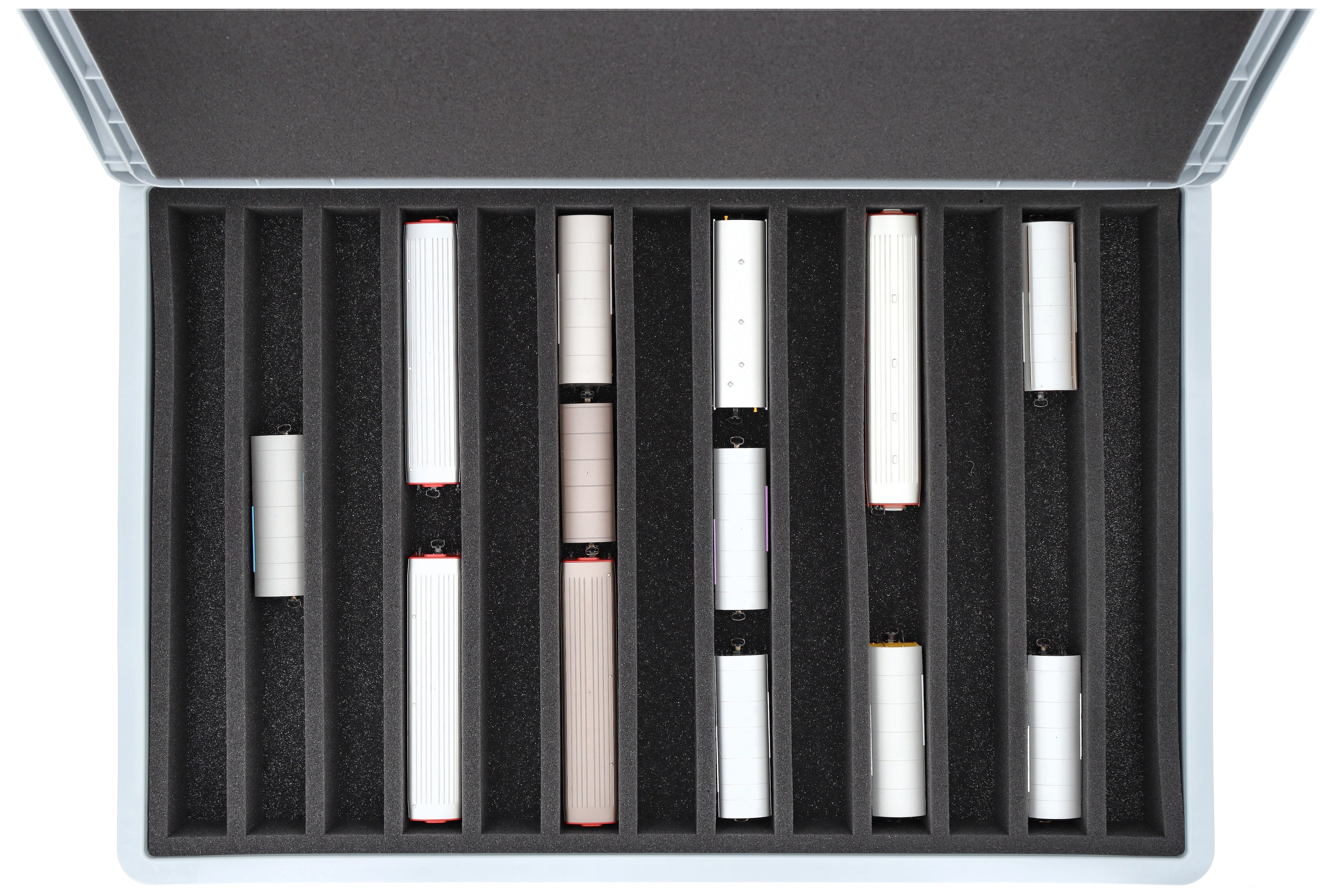 Die 13 gleich großen Fächer (je ca. 350 x 33 x 45 mm) sind speziell für Modelle der Spur H0m ausgelegt. Die präzise Passform sorgt dafür, dass die Modelle sicher fixiert sind und beim Transport nicht verrutschen.
