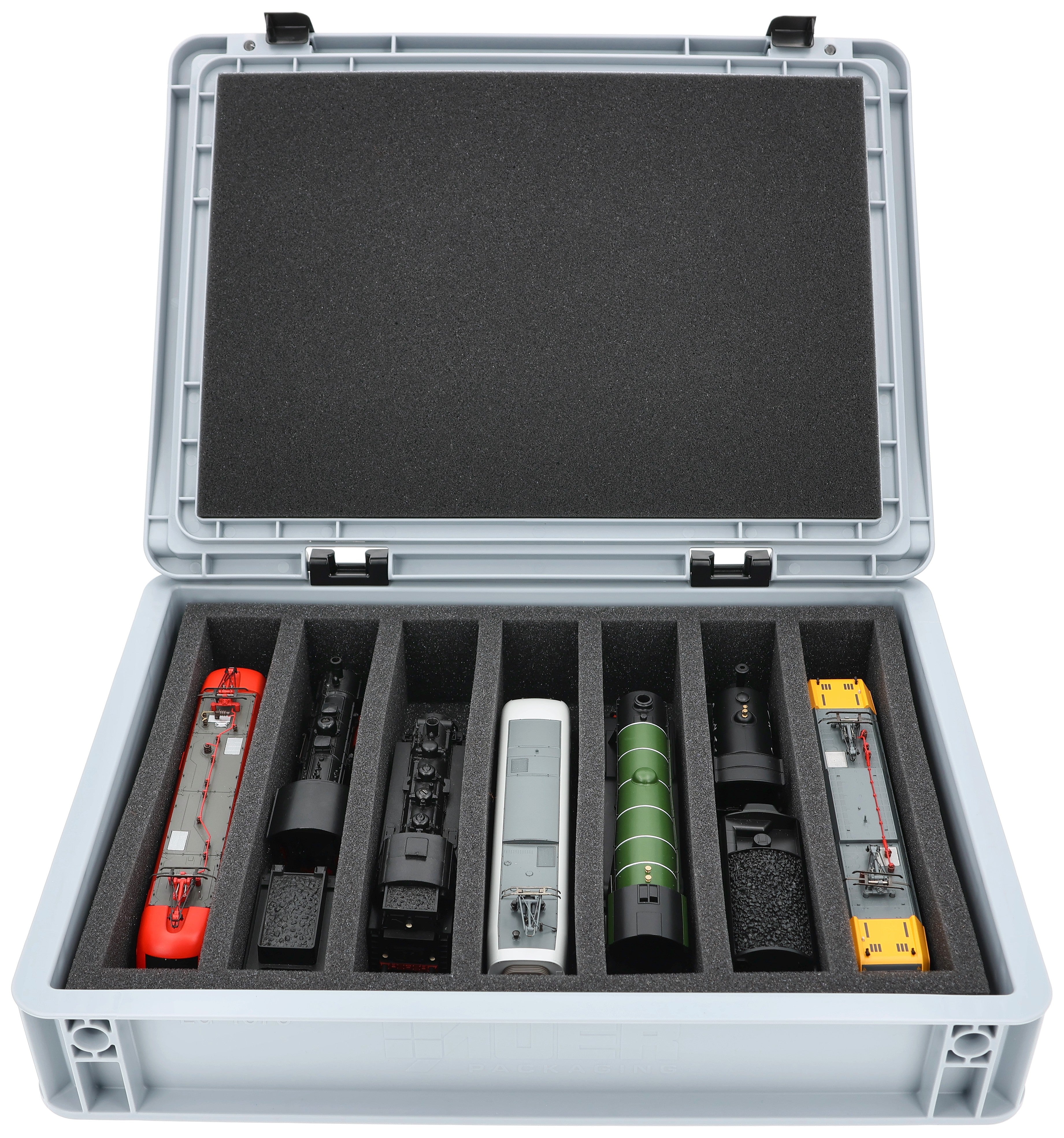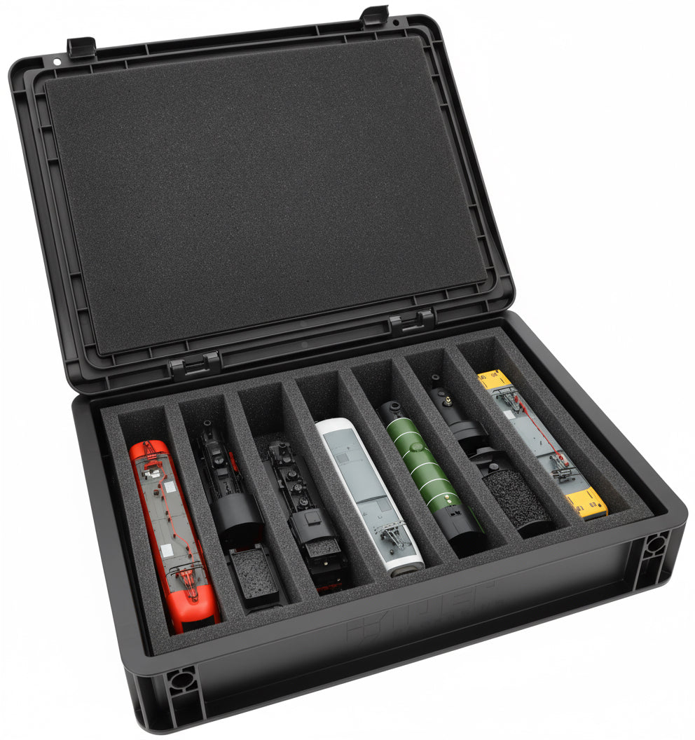 Für alle, die ihre Spur 00 Loks, Waggons und Fahrzeuge sicher und kompakt transportieren möchten: Dieses Feldherr Set kombiniert eine stapelbare Eurobox mit maßgeschneiderter Schaumstoffeinlage. Ob für die Fahrt zum Eisenbahner-Stammtisch, Modultreffen oder als platzsparende Lagerlösung daheim - deine Modelle sind jederzeit gut geschützt.