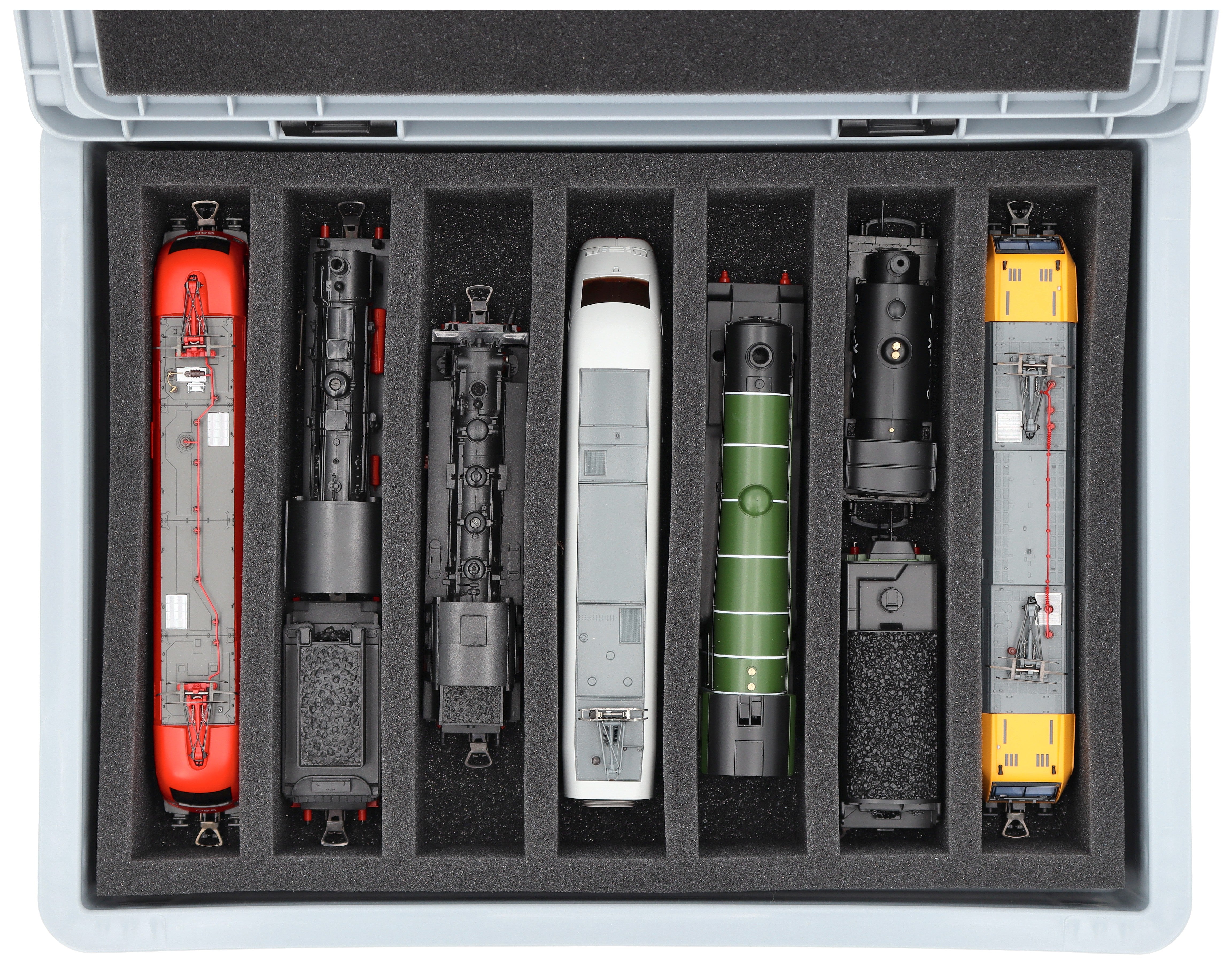 - 7 Fächer - Schaumstoffeinlage zur stehenden Aufbewahrung von Loks, Waggons und Fahrzeugen