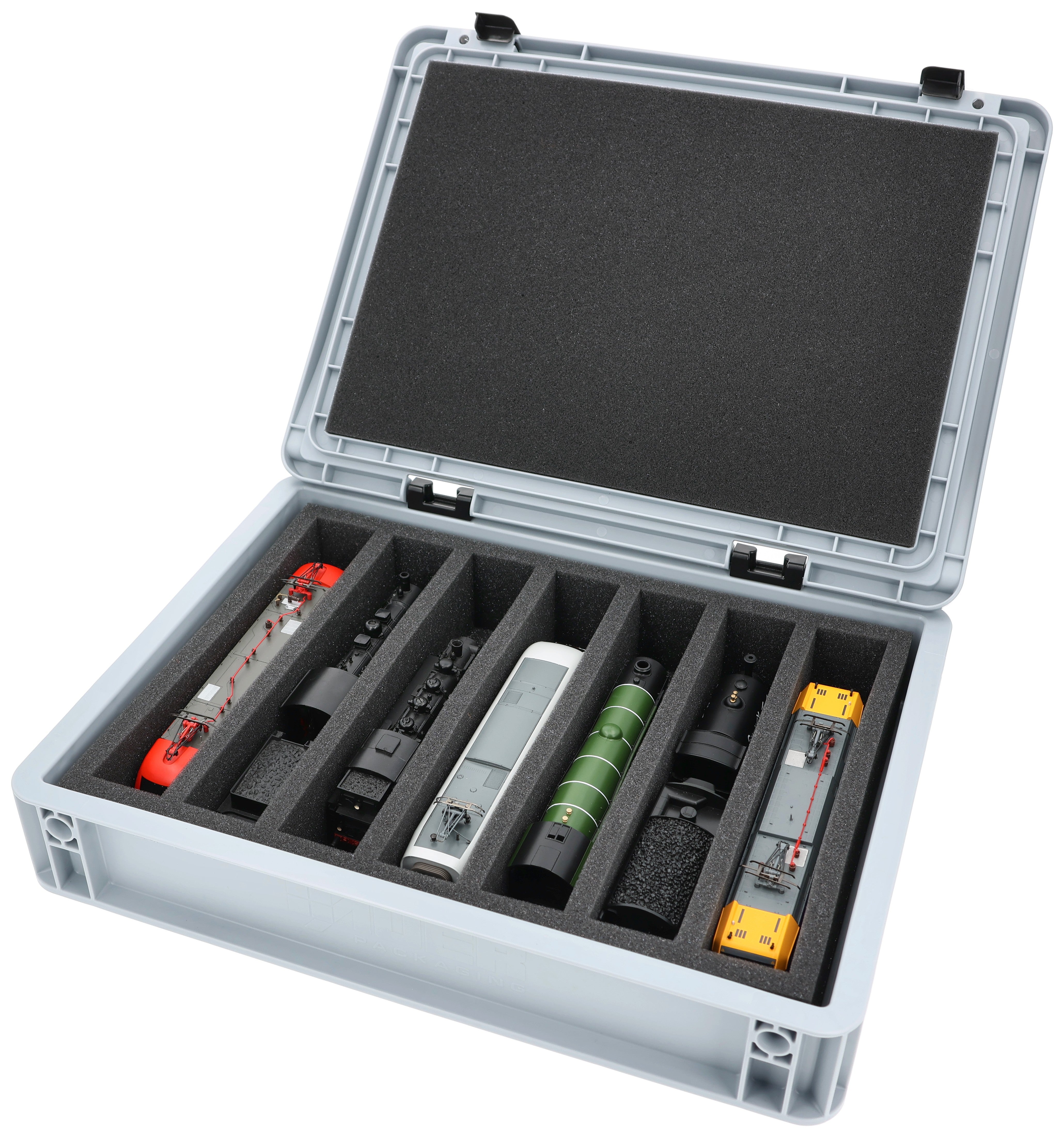 Die sieben gleich großen Fächer (je ca. 236 mm × 38 mm × 55 mm) sind speziell für Modelle der Spur 00 ausgelegt. Je nach Länge passen mehrere Waggons oder Lokomotiven nebeneinander. Die exakte Passform sorgt dafür, dass die Modelle sicher fixiert sind und beim Transport nicht verrutschen.