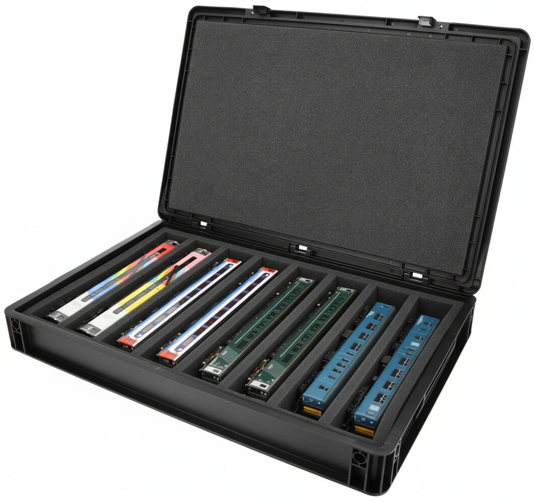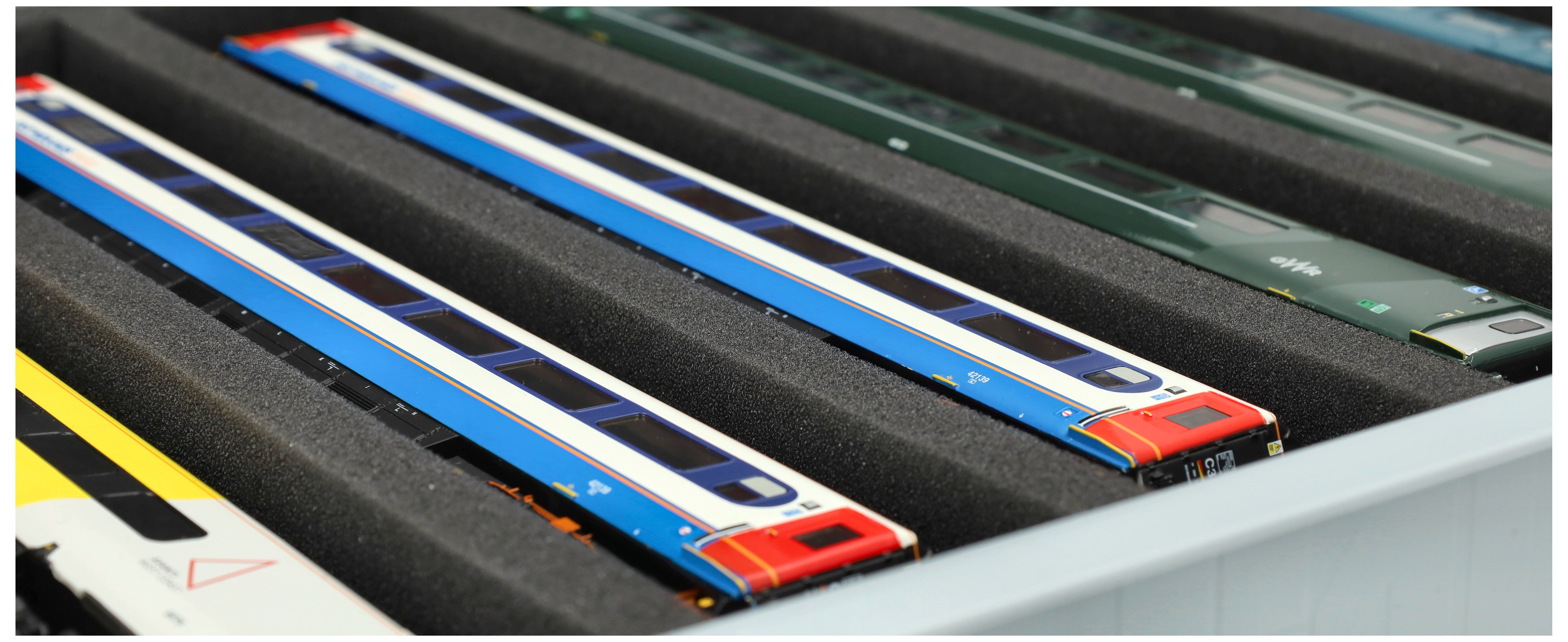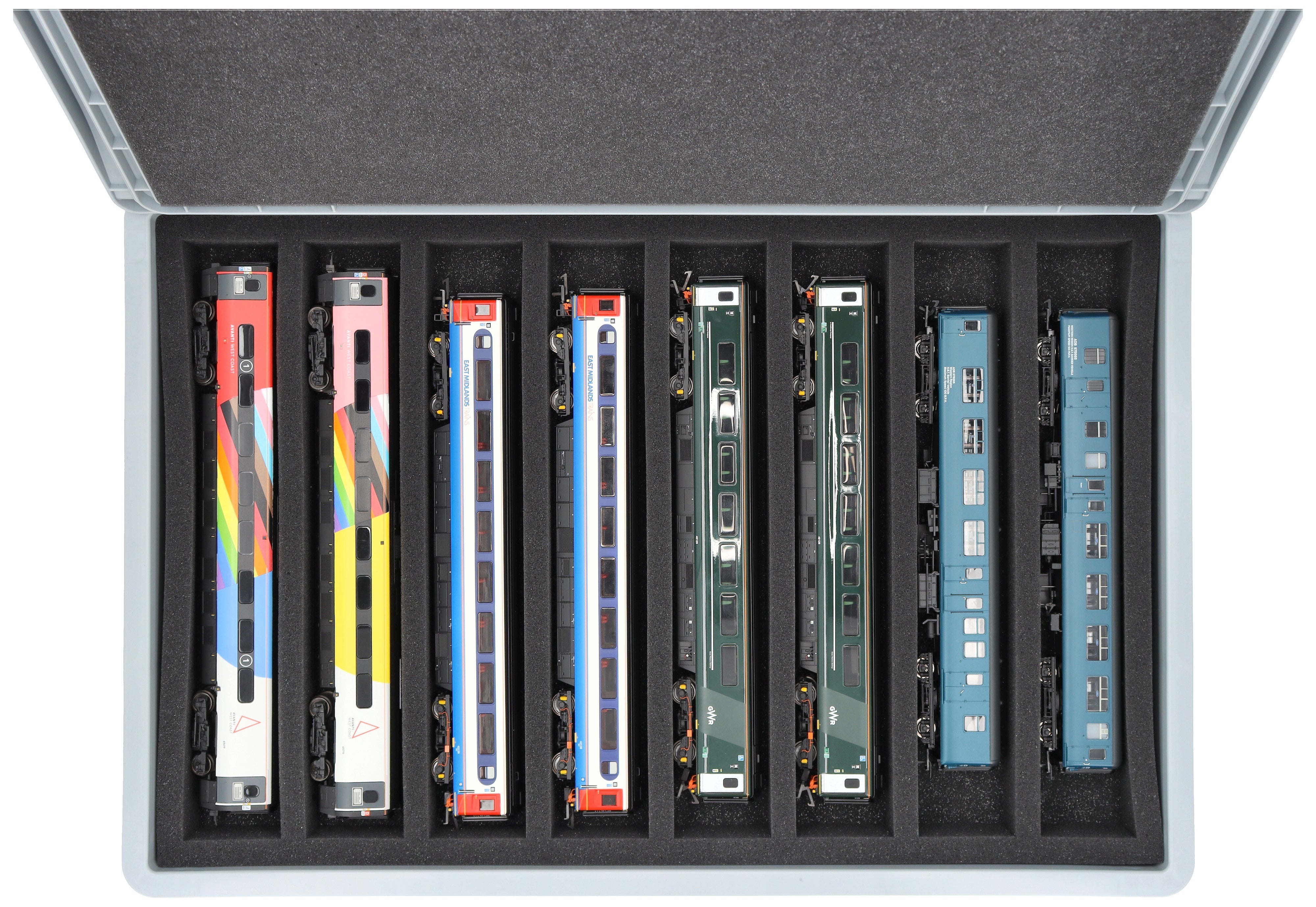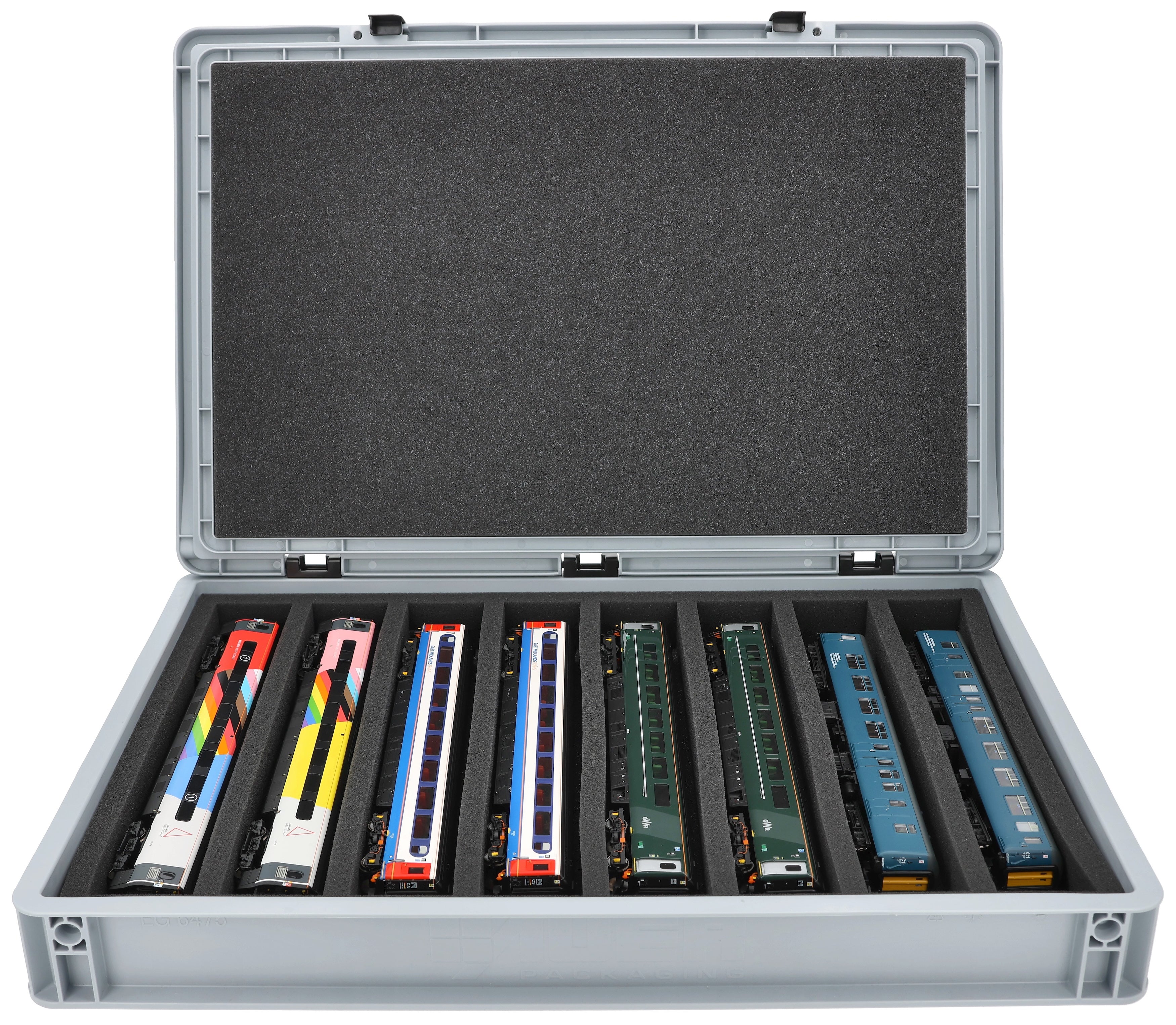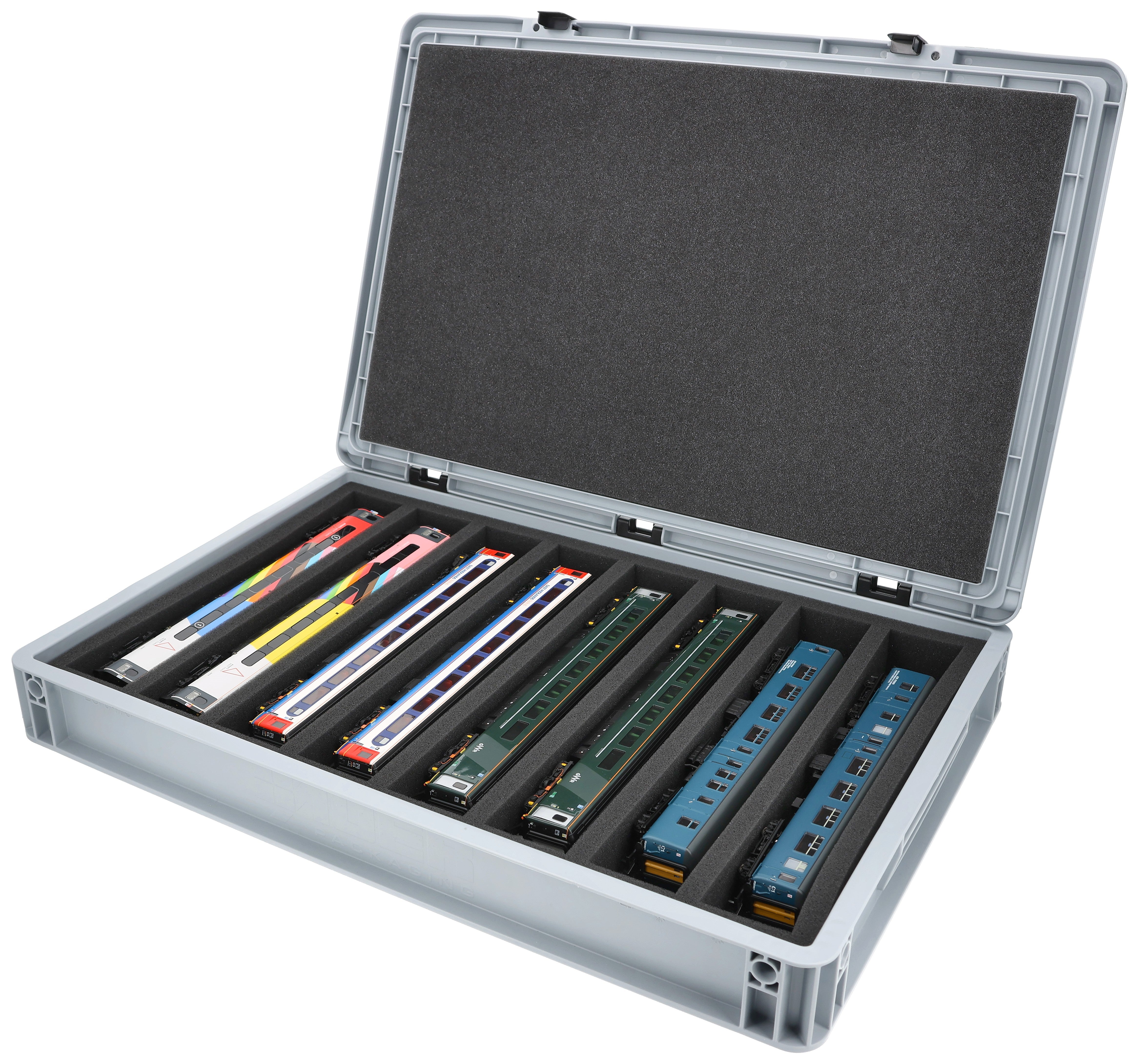 Die 8 gleich großen Fächer (je ca. 320 x 55 x 40 mm) sind speziell für Modelle der Spur 00 ausgelegt. Je nach Länge lassen sich Lokomotiven und Waggons nebeneinander platzieren. Die exakte Passform sorgt dafür, dass die Modelle sicher fixiert sind und beim Transport nicht verrutschen.