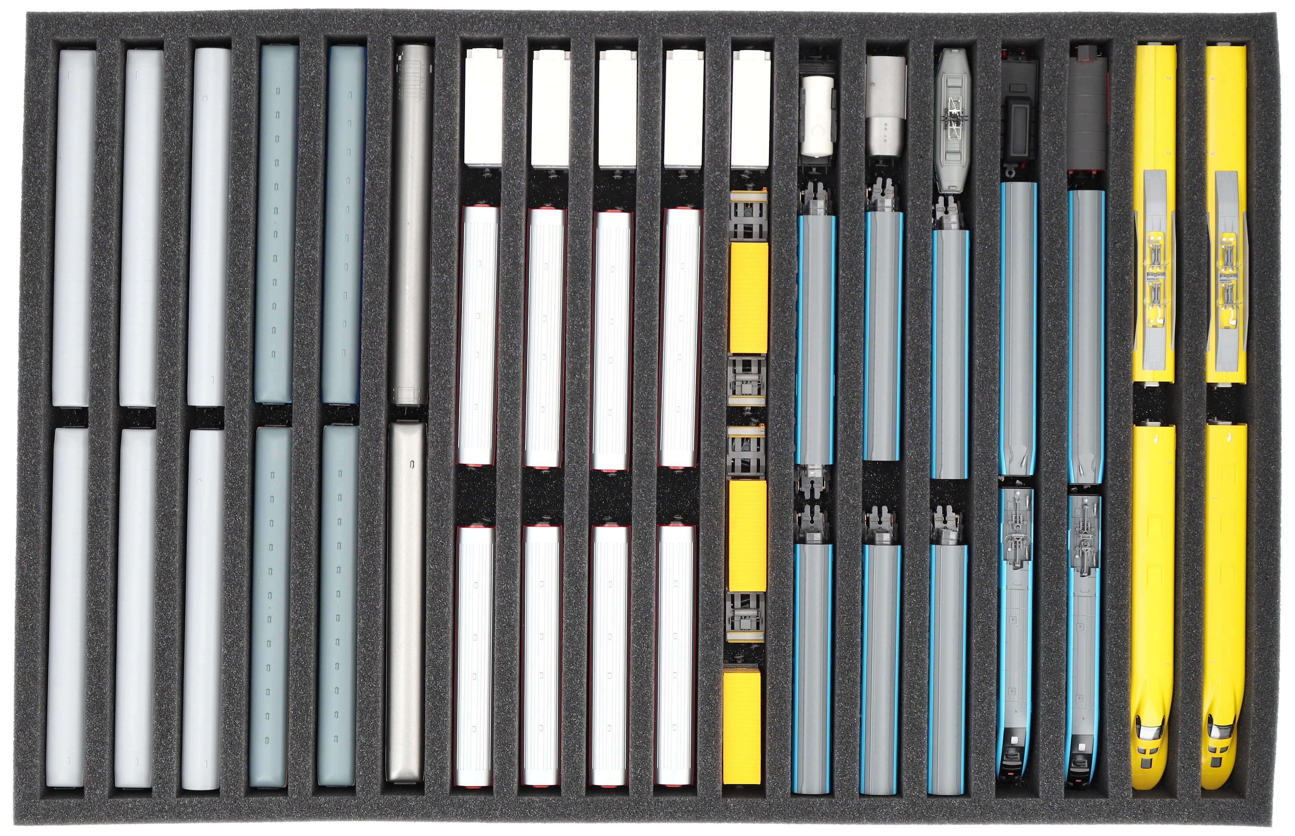 - Zusätzlich bieten wir passende Schaumstoff-Distanzstücke an (HS025A002). Diese verhindern, dass die Modelle beim Transport aneinanderstoßen oder ungewollt ankuppeln.