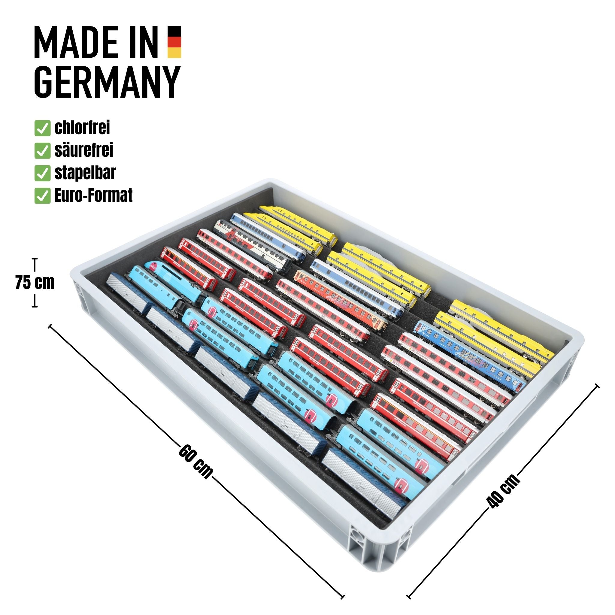 In dem robusten Eurobehälter von AUER Packaging aus stoßfestem und formbeständigen Kunststoff, ist Ihre Modellbahn-Sammlung absolut sicher verstaut.