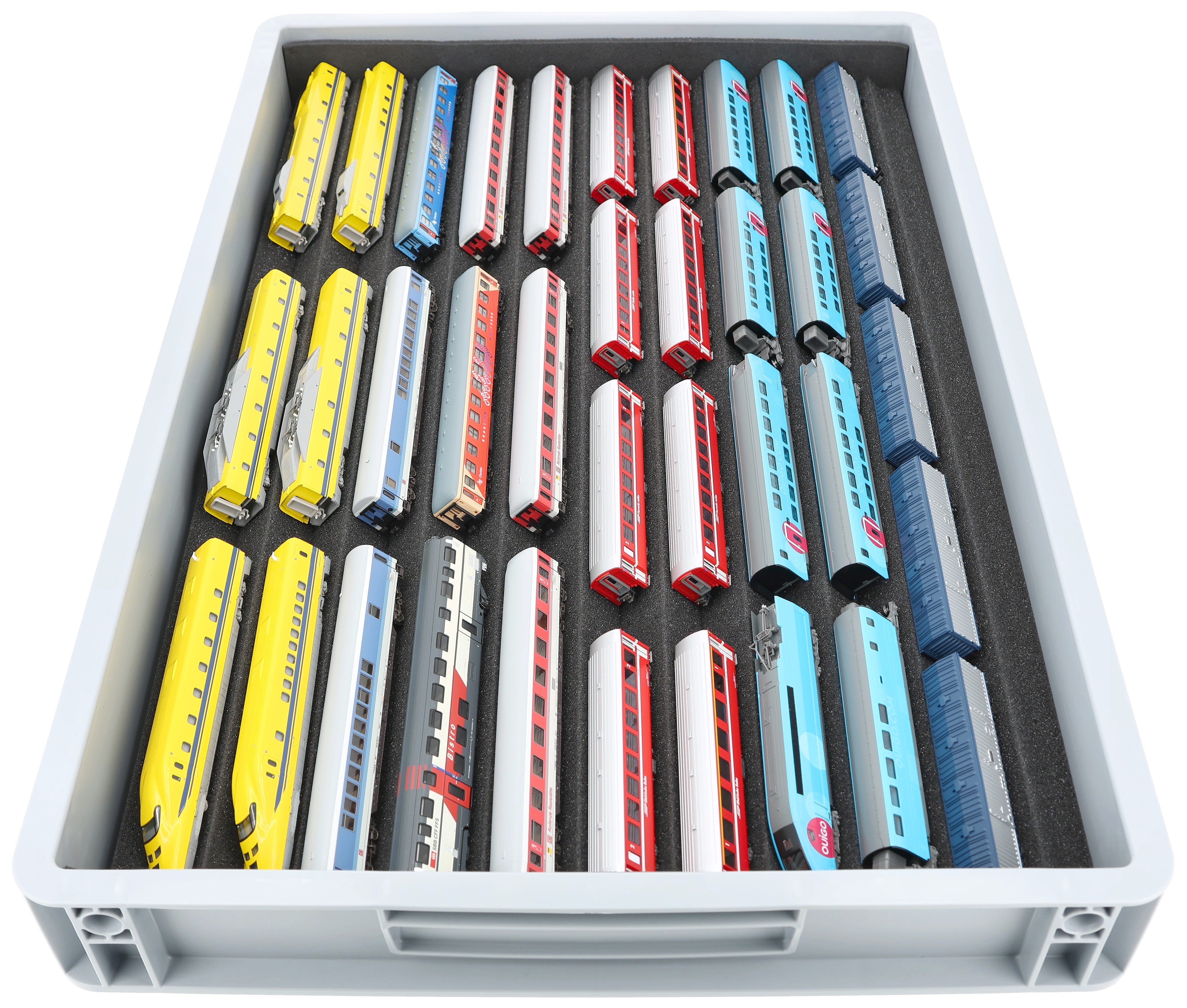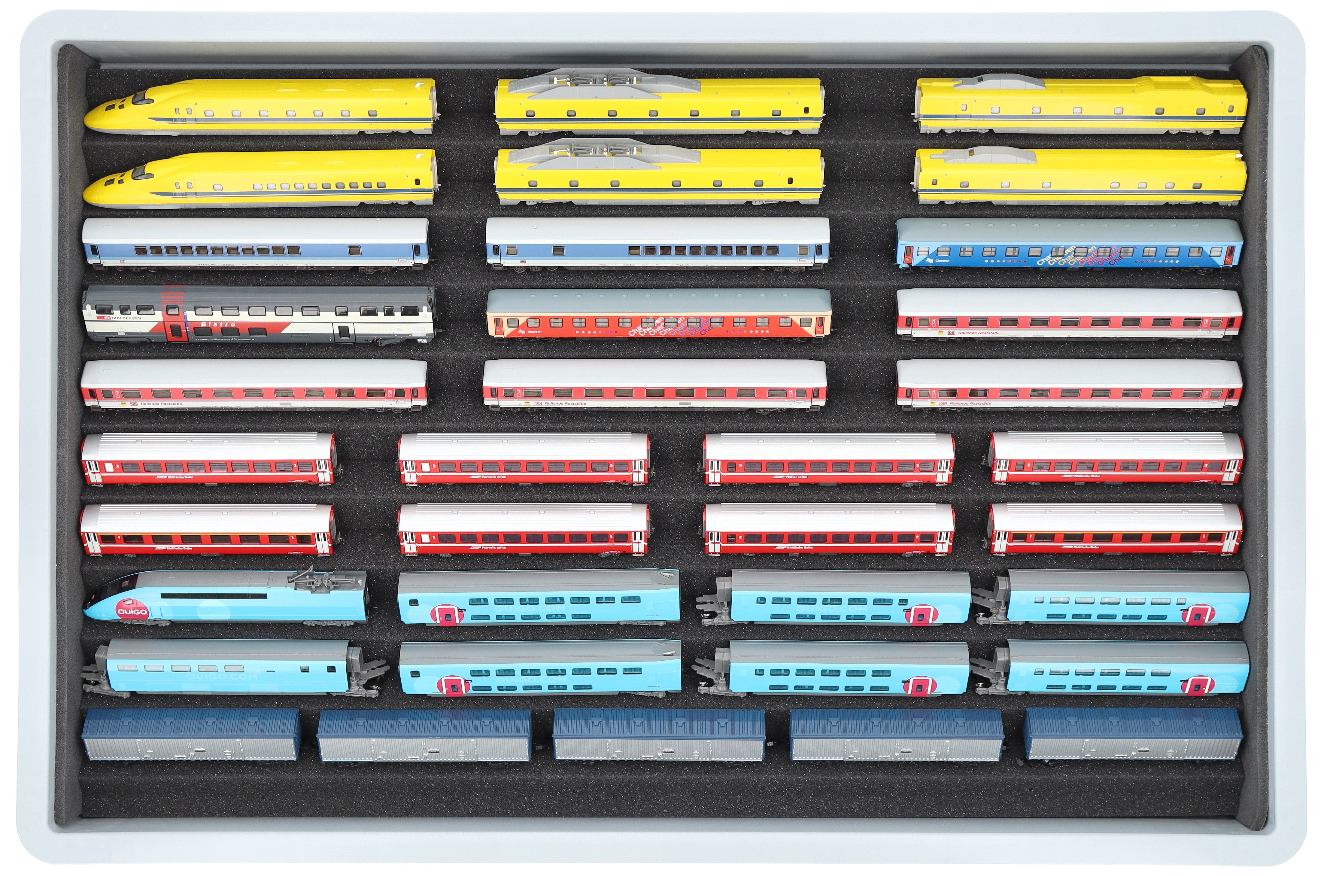 Zehn Fächer, maßgeschneidert für Modelleisenbahnen in Nenngröße N, bieten Ihren Loks und Waggons zuverlässigen Schutz für Lagerung und Transport.