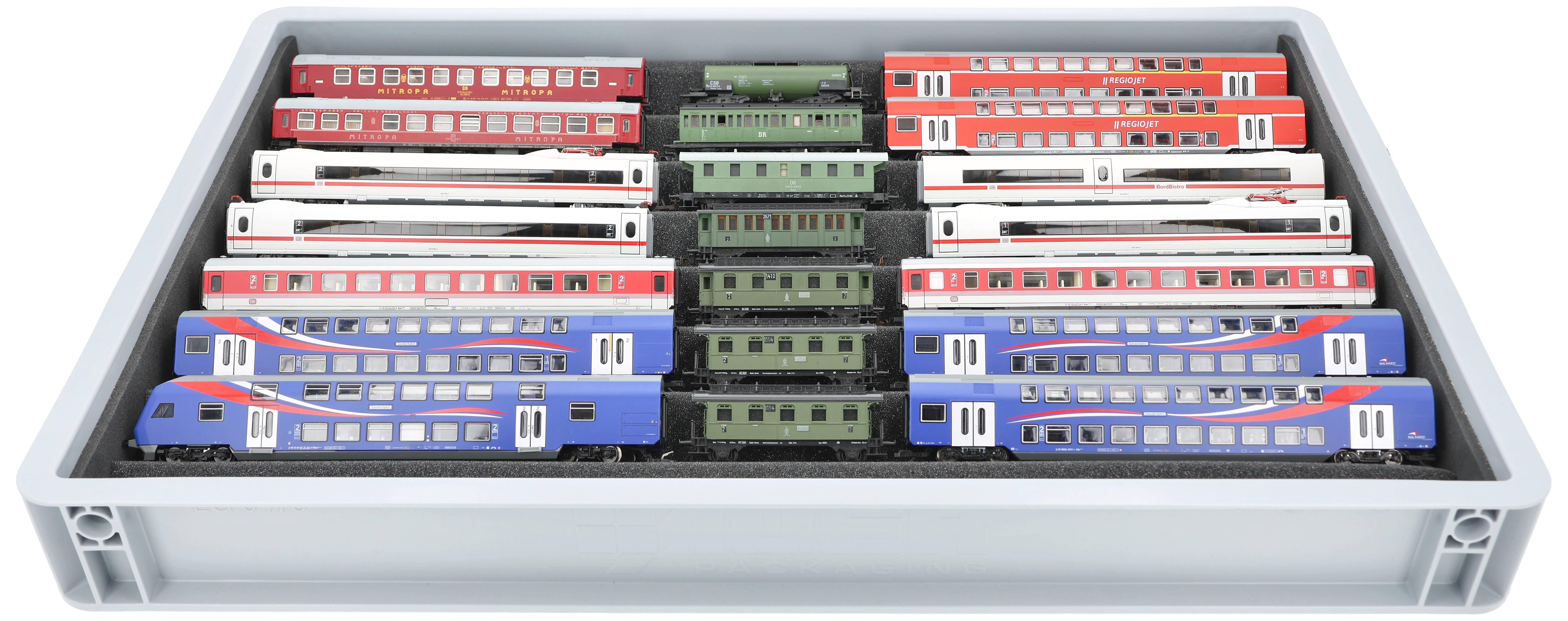 In dem robusten Eurobehälter von AUER Packaging aus stoßfestem und formbeständigen Kunststoff, ist Ihre Modellbahn-Sammlung absolut sicher verstaut.