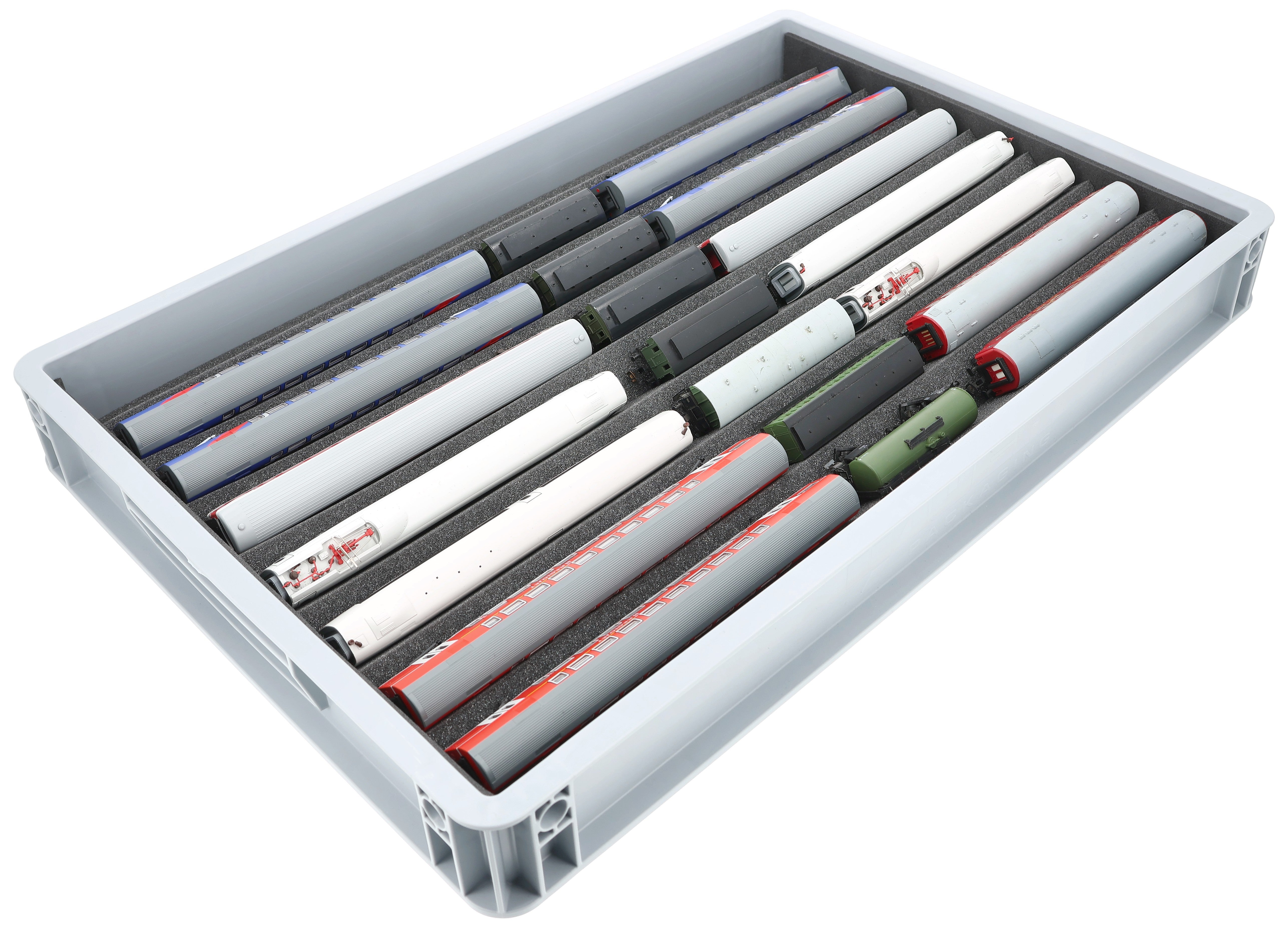Stapelbare Eurobox 60 x 40 cm Set mit Zugliege für Modelleisenbahn - 7 Fächer für Spur TT