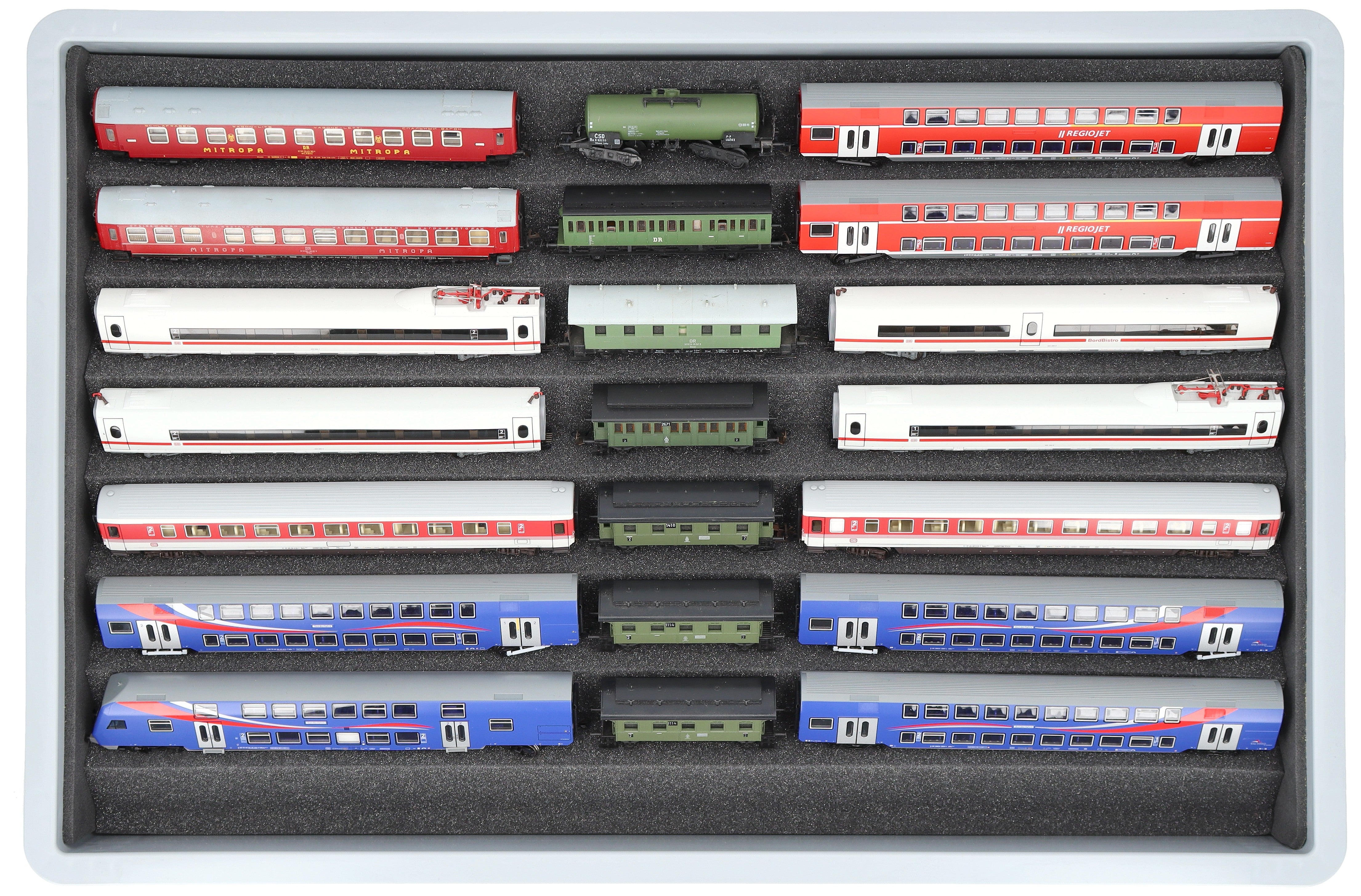 Mehrere Züge und Wagen können nebeneinander in einem Fach untergebracht werden. Um ein Aneinanderstoßen oder ungewolltes Ankuppeln zu verhindern, enthält das Set auch die passenden Schaumstoff-Distanzstücke. Weitere Abstandshalter sind separat erhältlich (HS025A001).