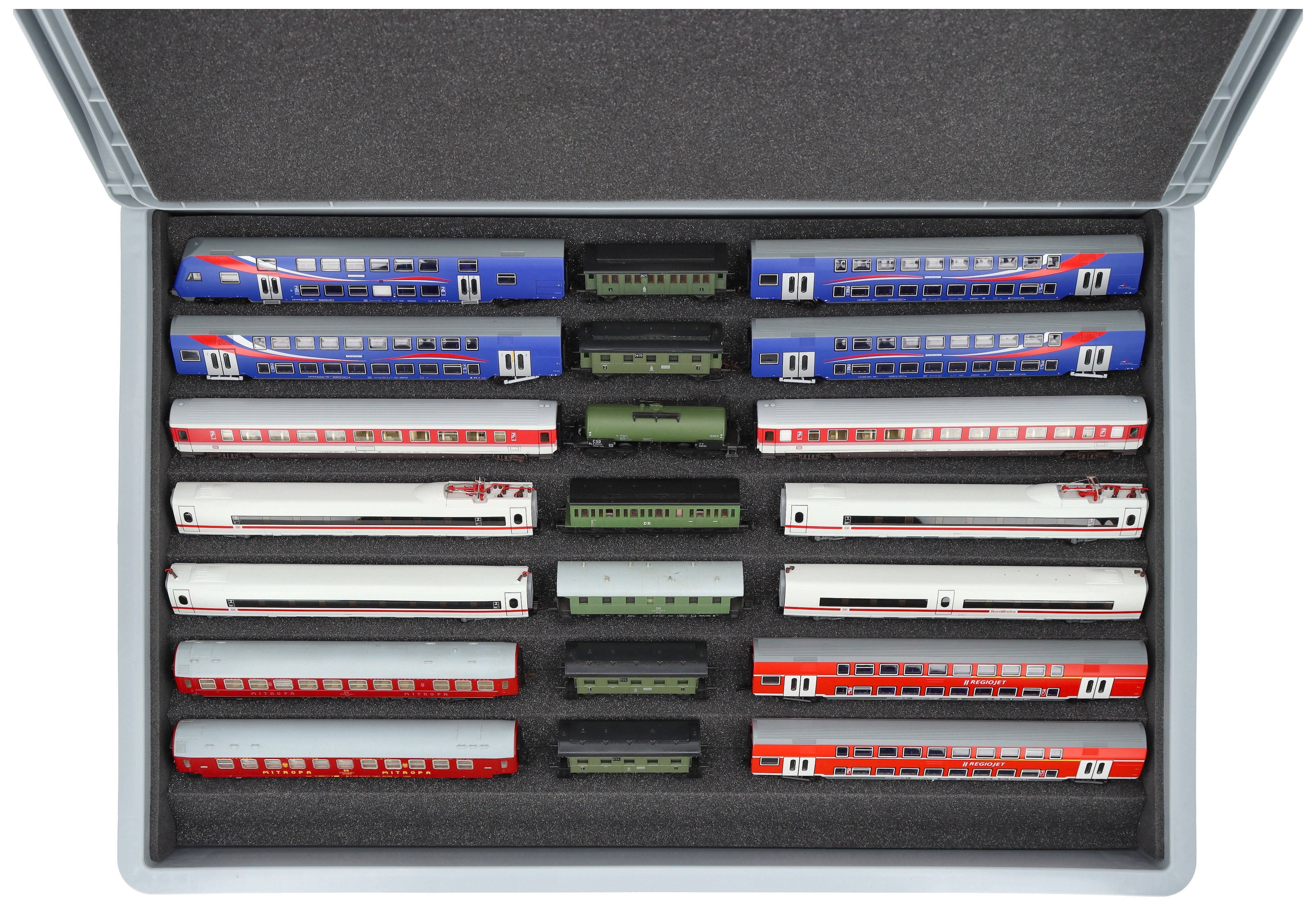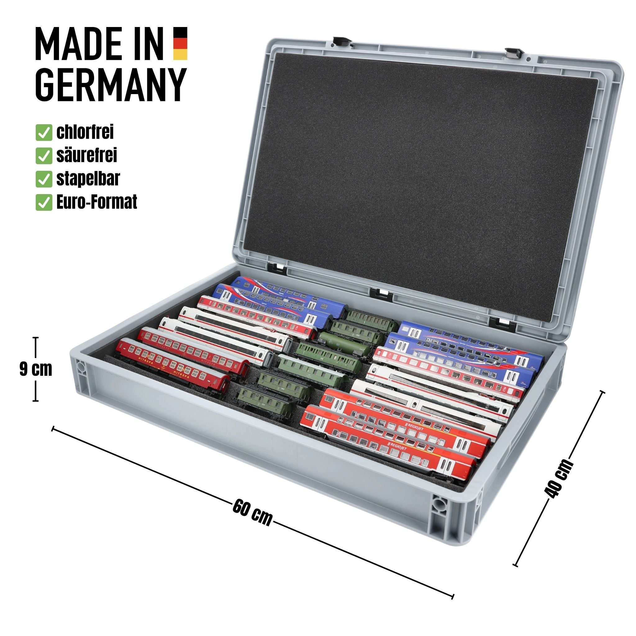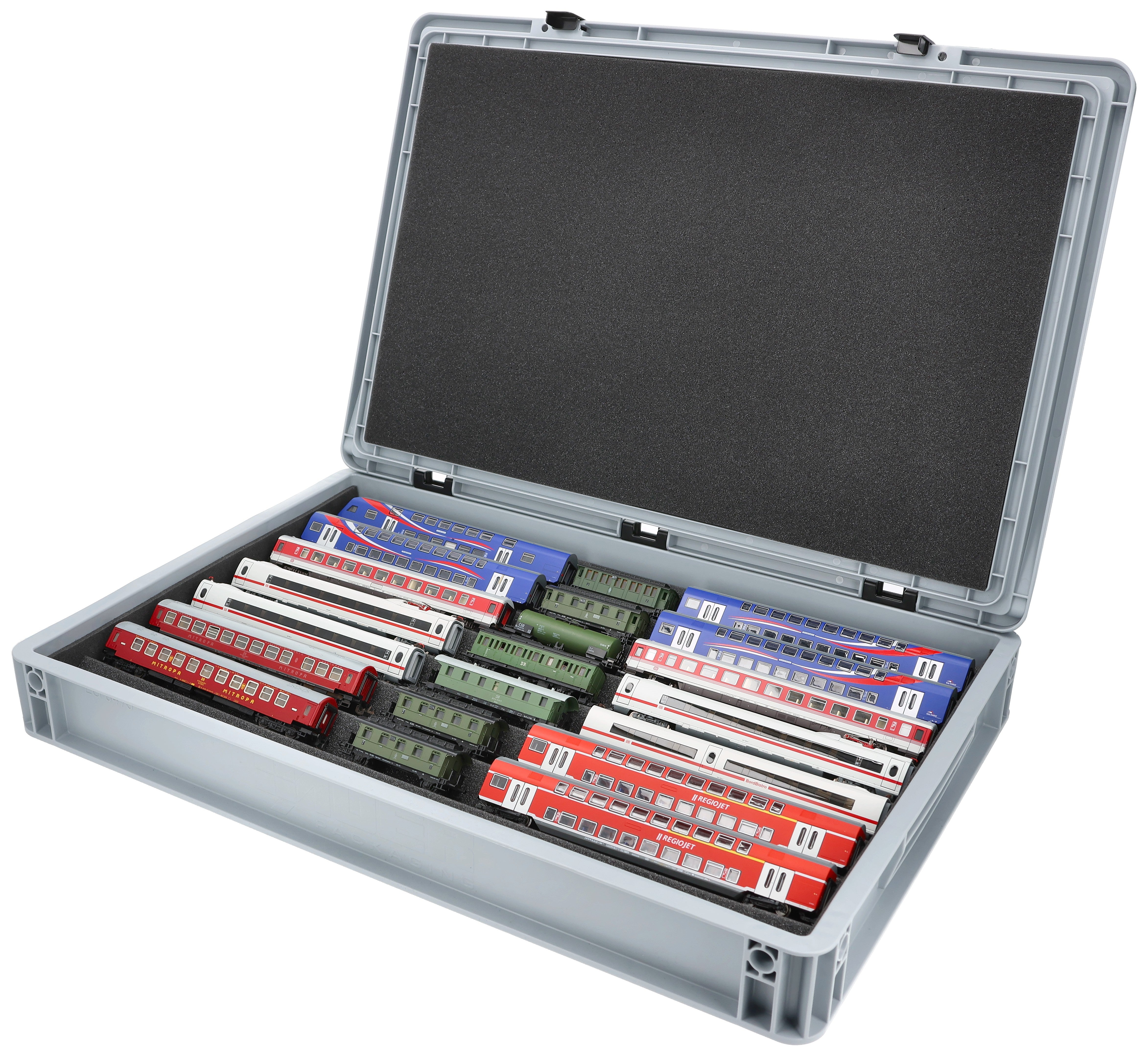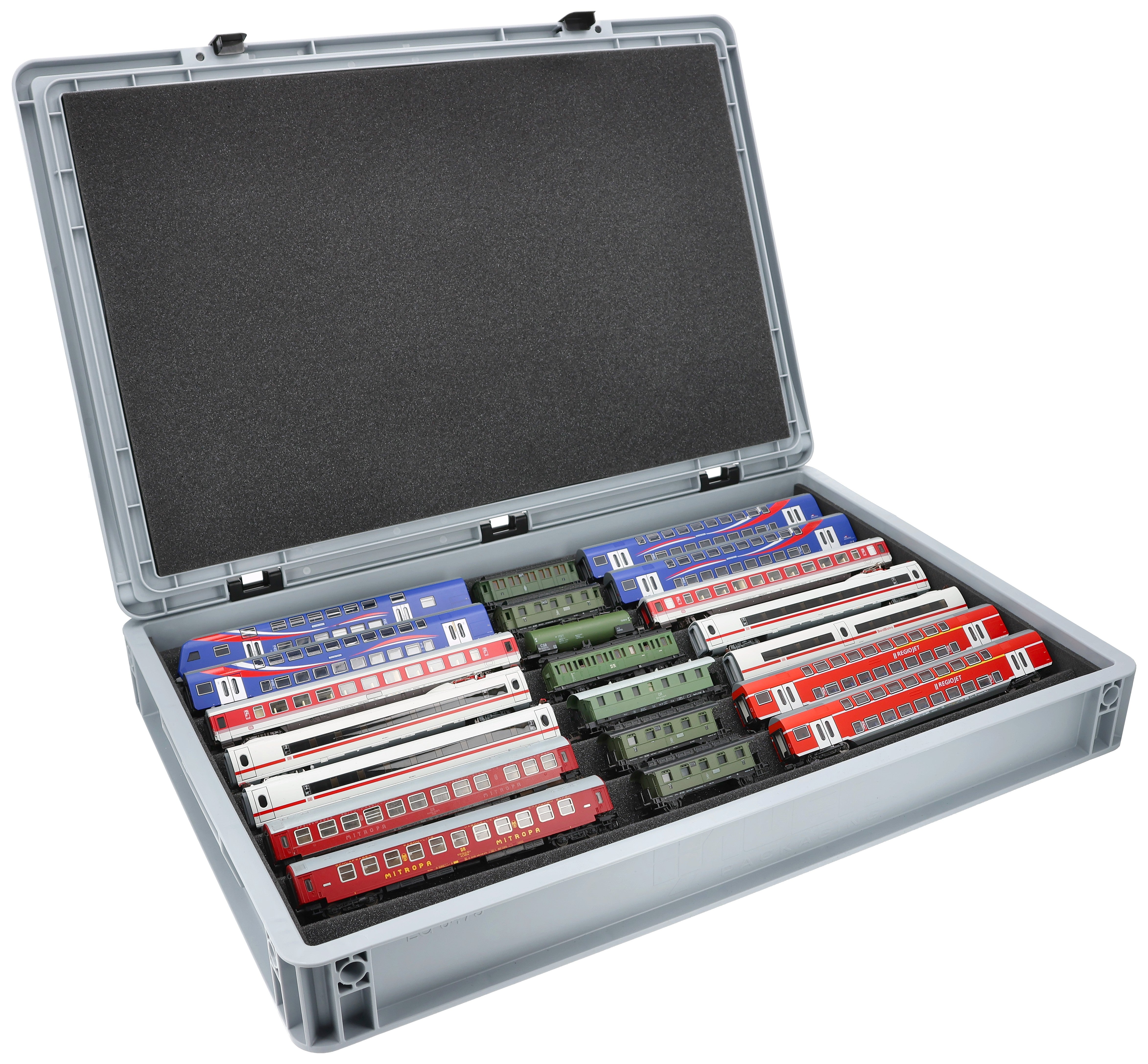Ordentlich aufbewahrt, anschaulich präsentiert und sicher transportiert – Die flexible Schaumstoffeinlage für Modelleisenbahnen in Spur TT in der stabilen Eurobox.