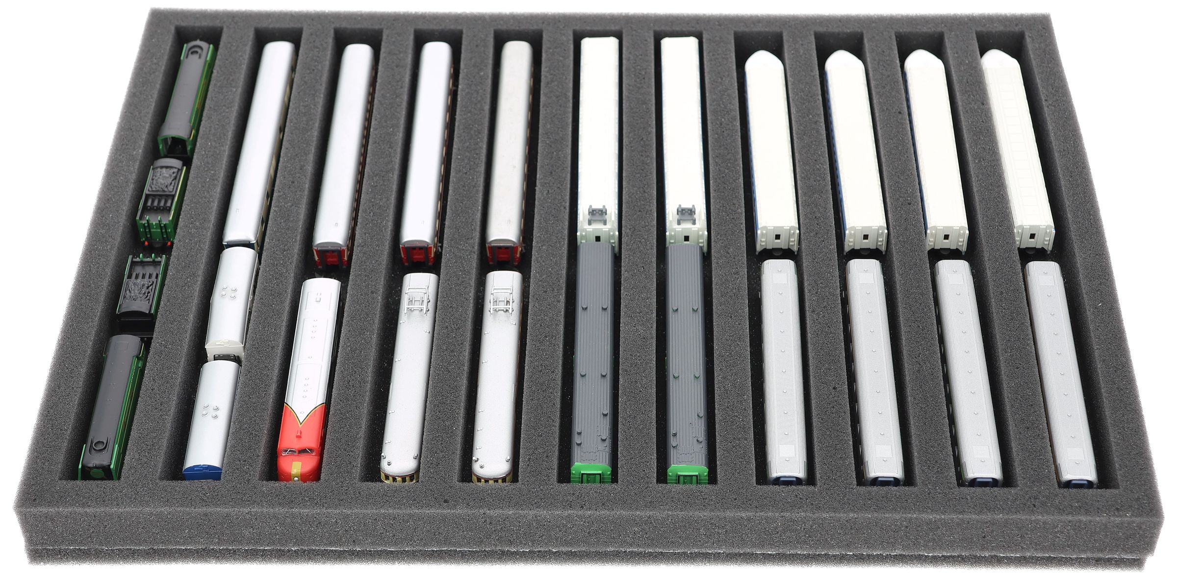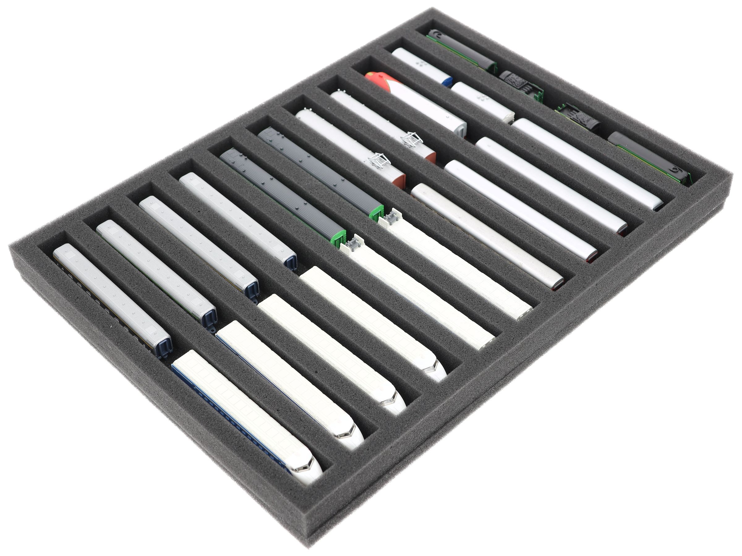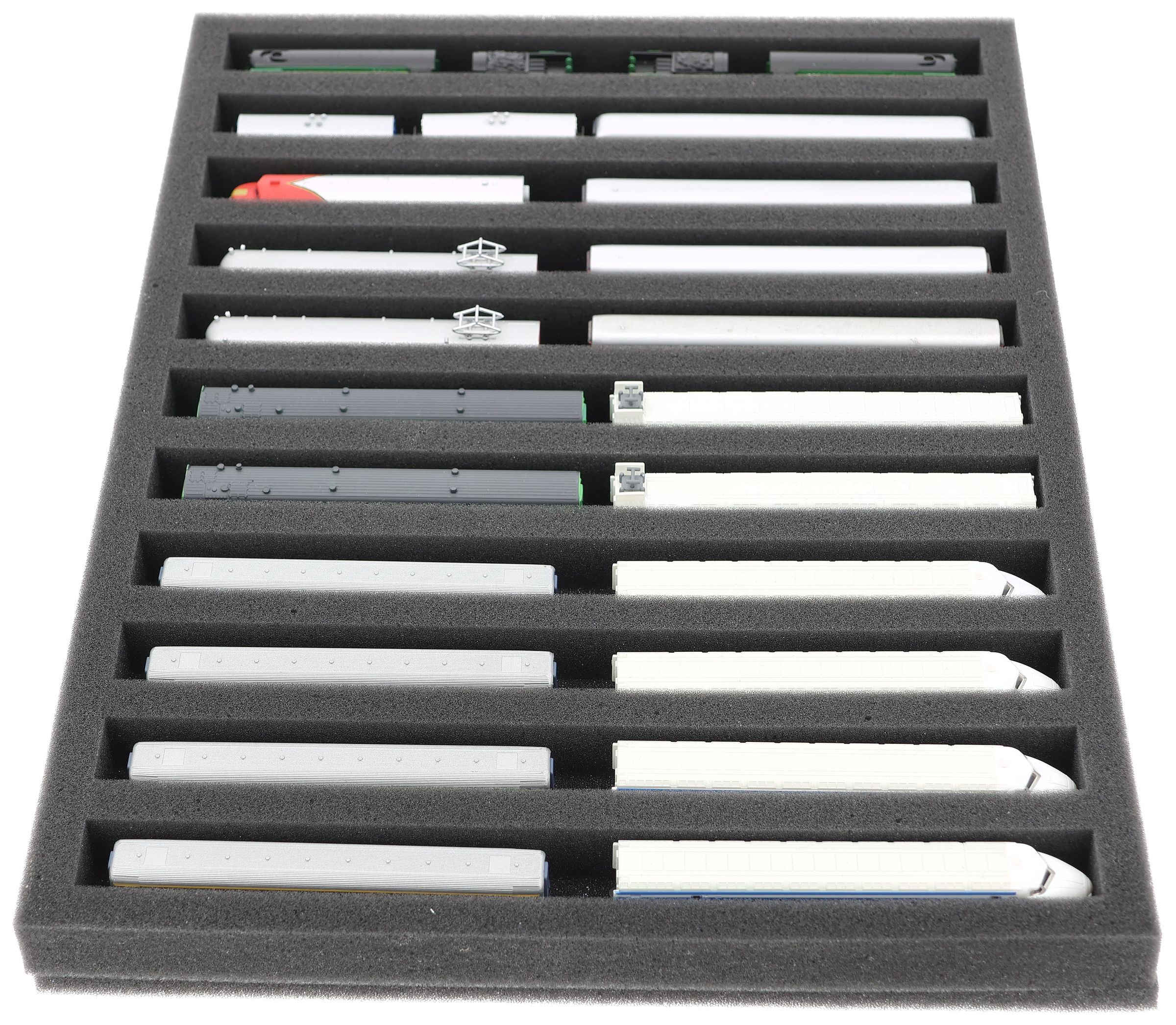 - Zusätzlich bieten wir passende Schaumstoff-Distanzstücke an (HS025A001, HS025A002). Diese verhindern, dass die Modelle beim Transport aneinanderstoßen oder ungewollt ankuppeln.