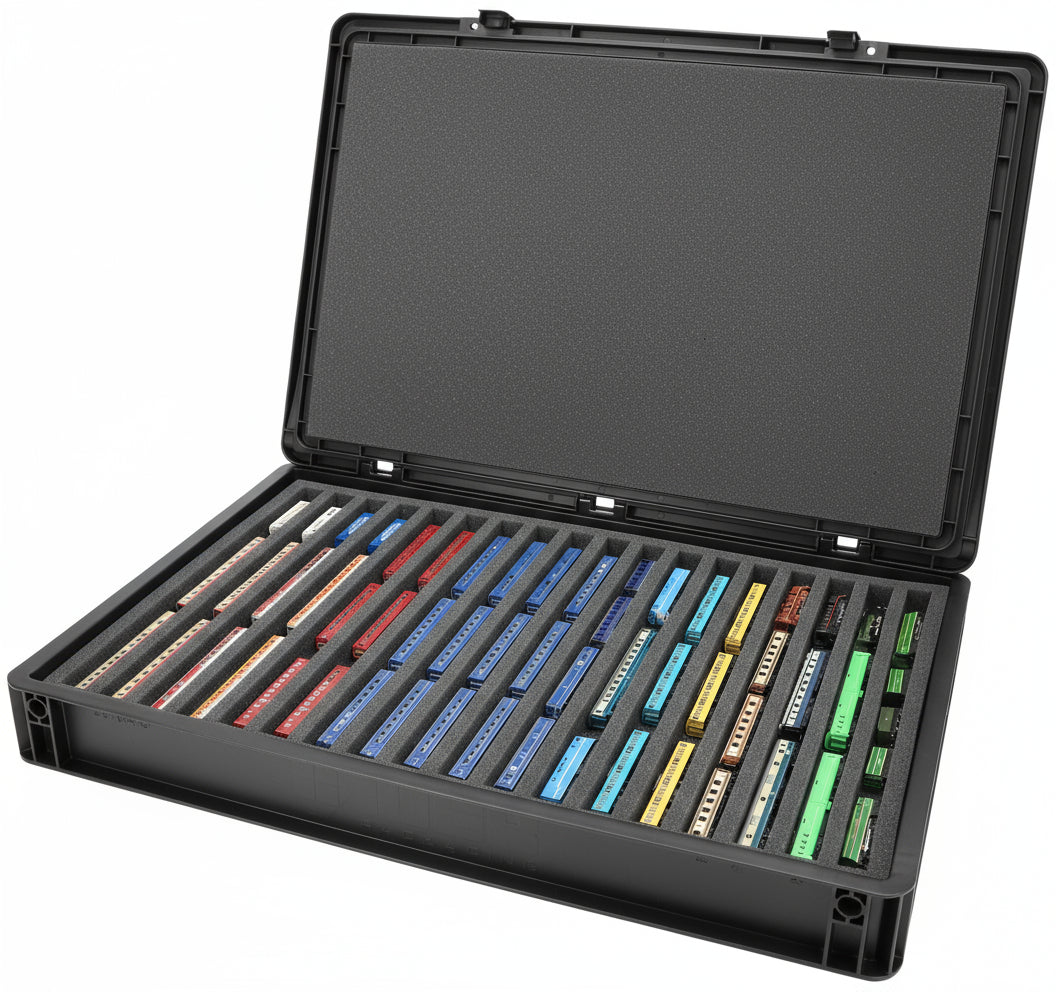 Die 18 gleich großen Fächer (je ca. 350 x 20 x 20 mm) sind speziell für Modelle der Spur Z ausgelegt. Je nach Länge lassen sich mehrere Waggons oder Lokomotiven nebeneinander platzieren. Die exakte Passform sorgt dafür, dass die Modelle sicher fixiert sind und beim Transport nicht verrutschen.