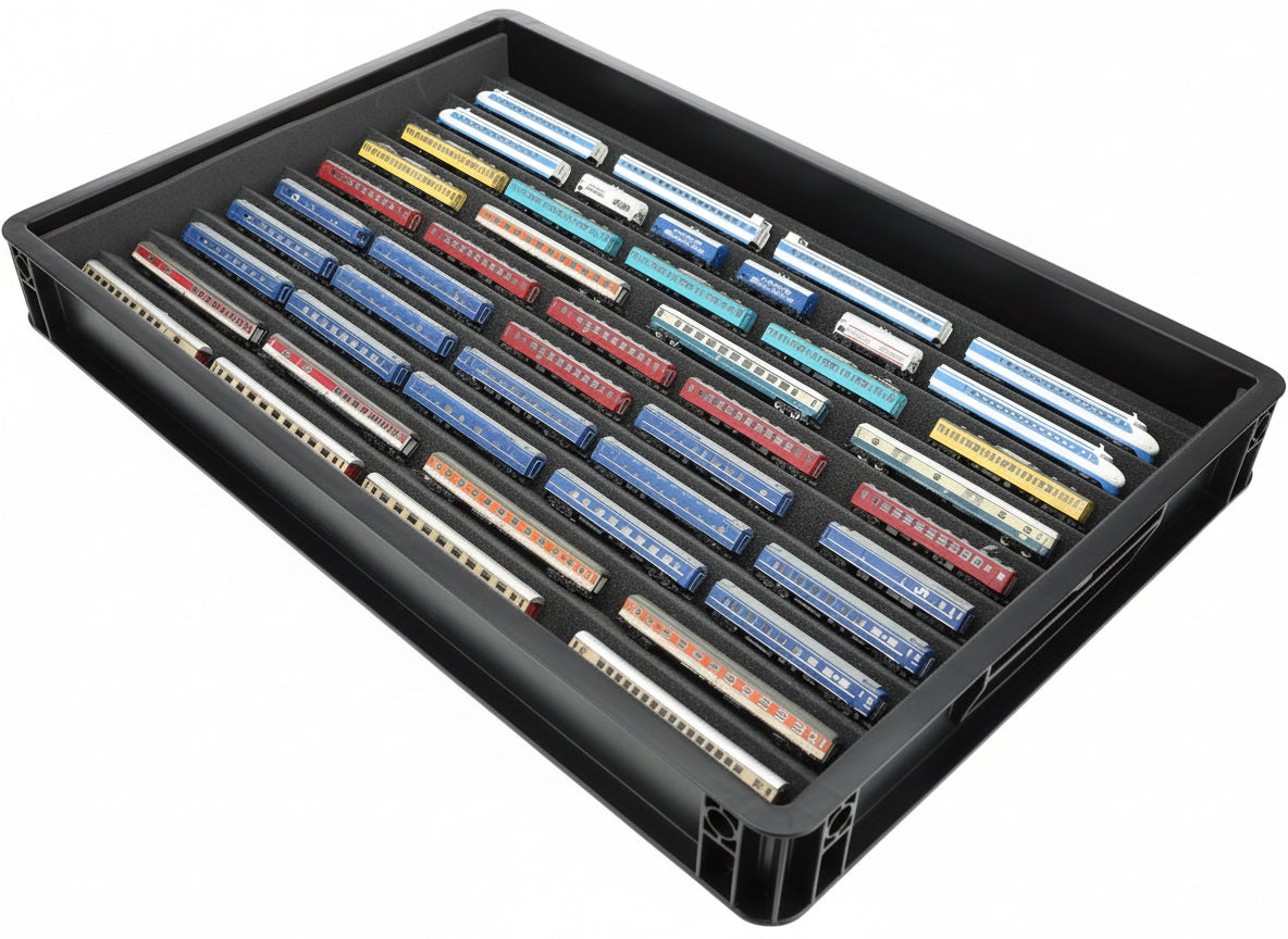 In dem robusten Eurobehälter von AUER Packaging aus stoßfestem und formbeständigen Kunststoff, ist Ihre Z-Spur Modellbahn-Sammlung absolut sicher verstaut.
