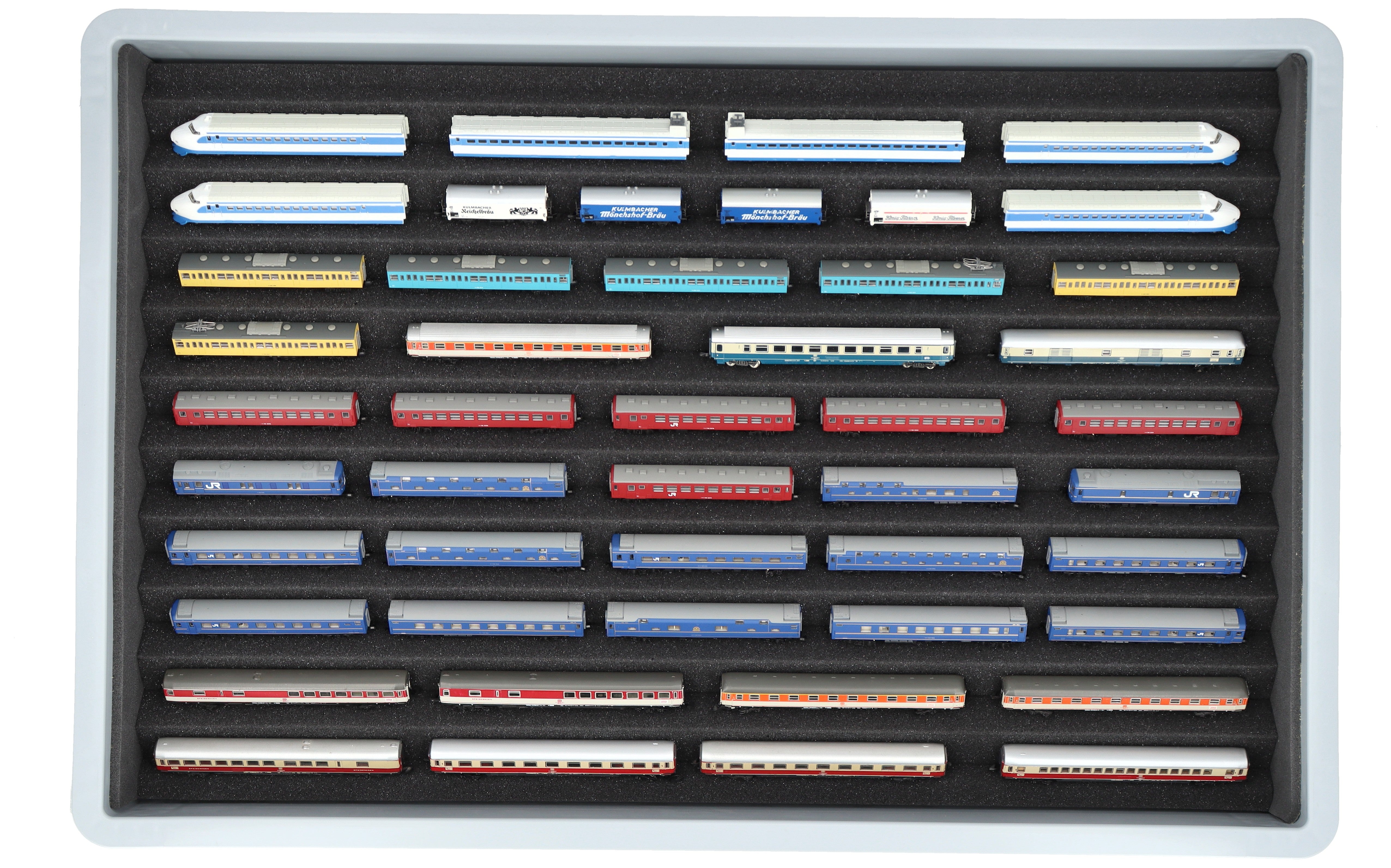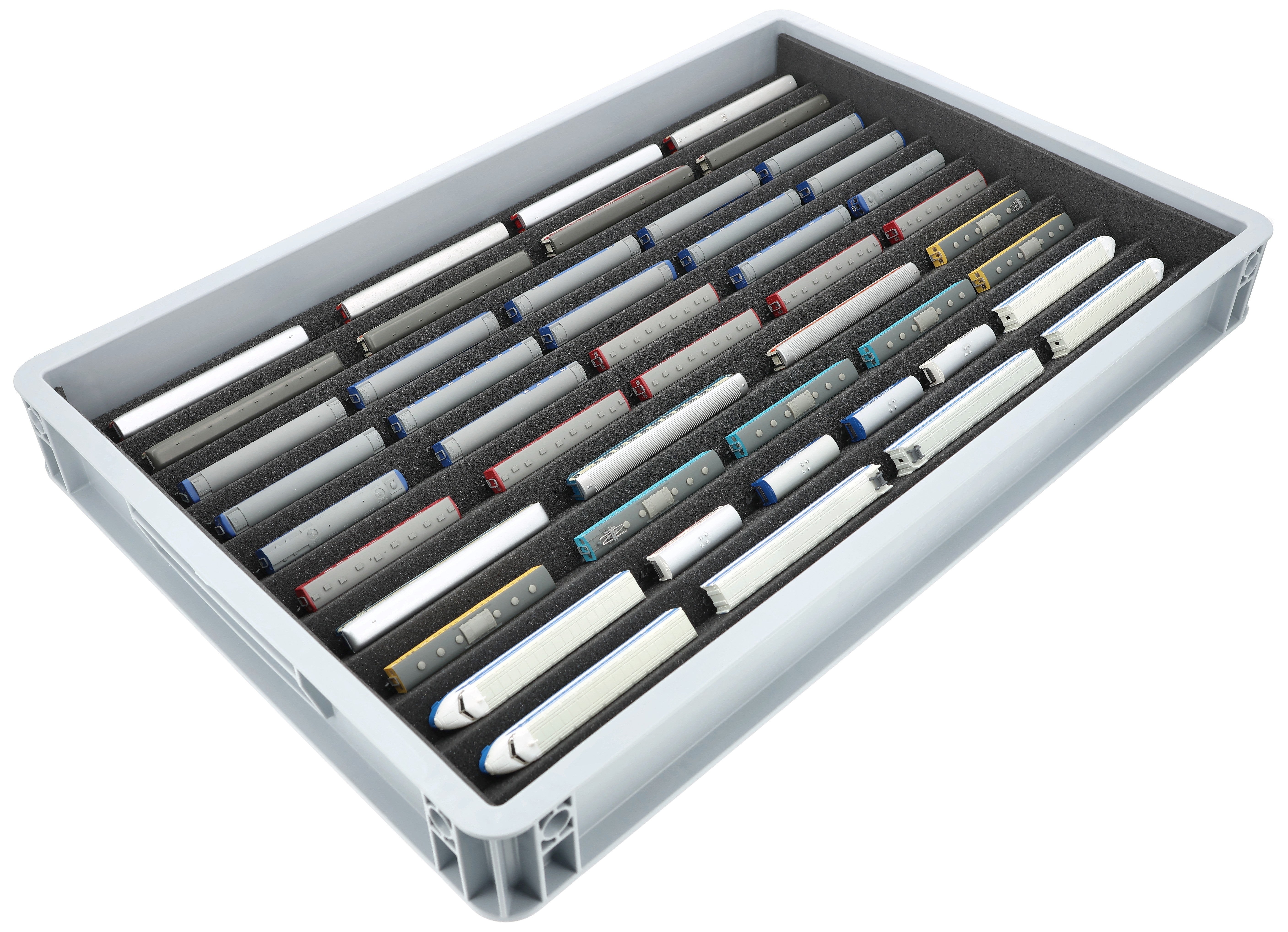 Zehn Fächer, maßgeschneidert für Modelleisenbahnen in Nenngröße Z, bieten Ihren Z-Spur Loks und Waggons zuverlässigen Schutz für Lagerung und Transport.