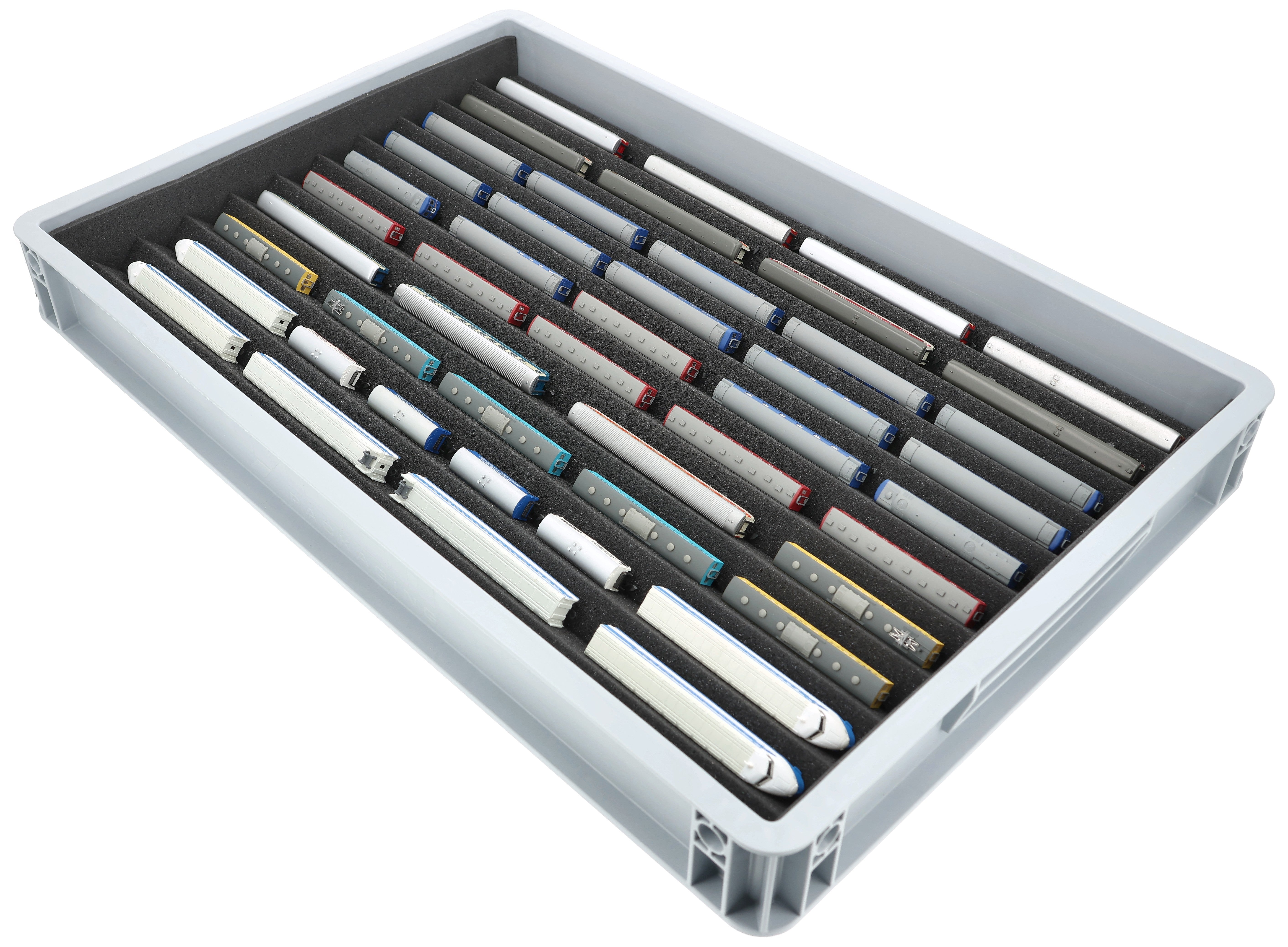 Stapelbare Eurobox 60 x 40 cm mit Zugliege für Modelleisenbahn - 10 Fächer für Spur Z