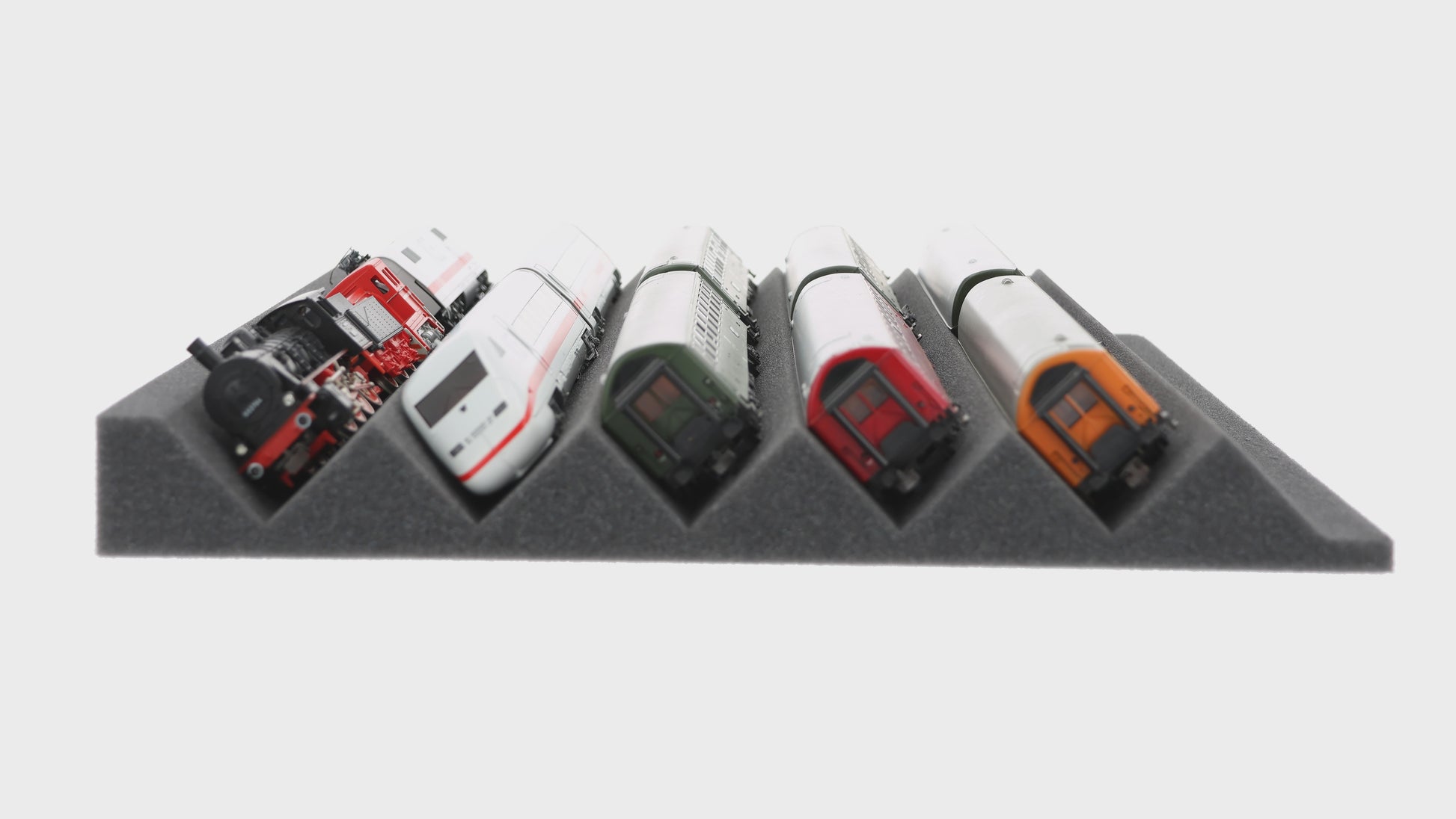 With the Feldherr Train Tray, you can not only neatly store and safely transport your models. Thanks to the v-shaped compartments, you can simultaneously use the insert as a display to present your own collection. The models rest at an angle and are easily accessible from the sides. Therefore, the Train Tray is also well-suited as an angled support for minor maintenance work and repairs on your locomotives.