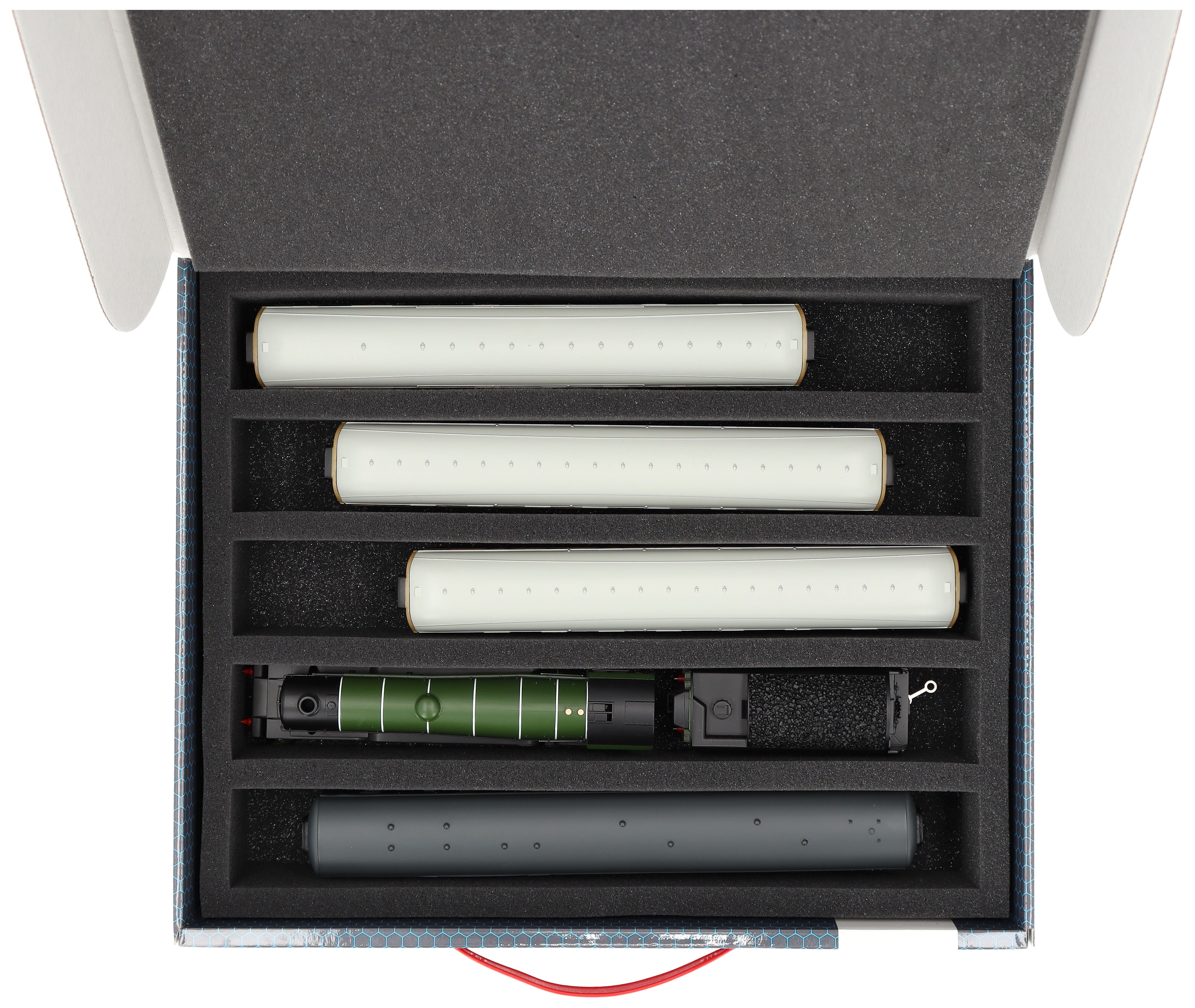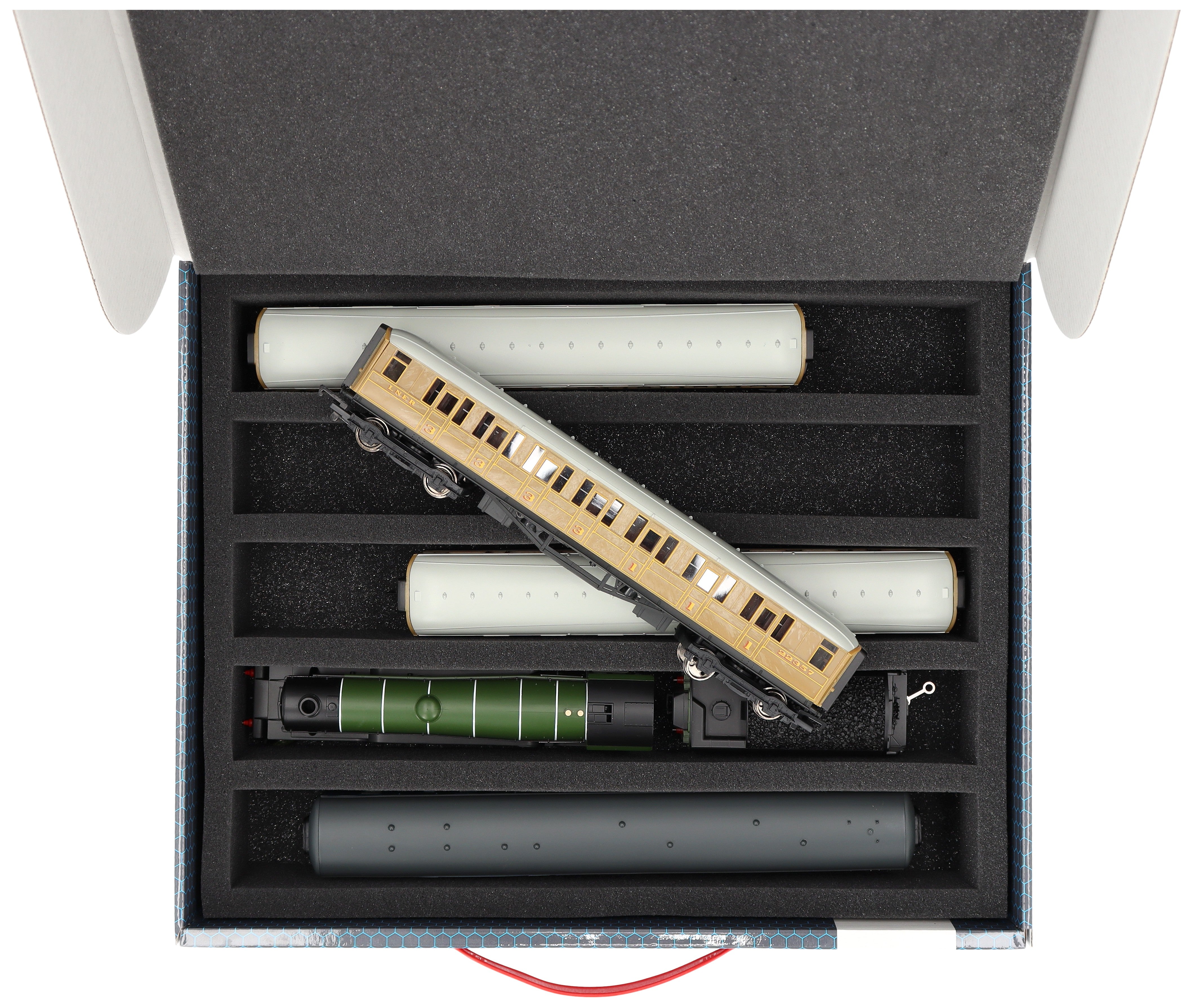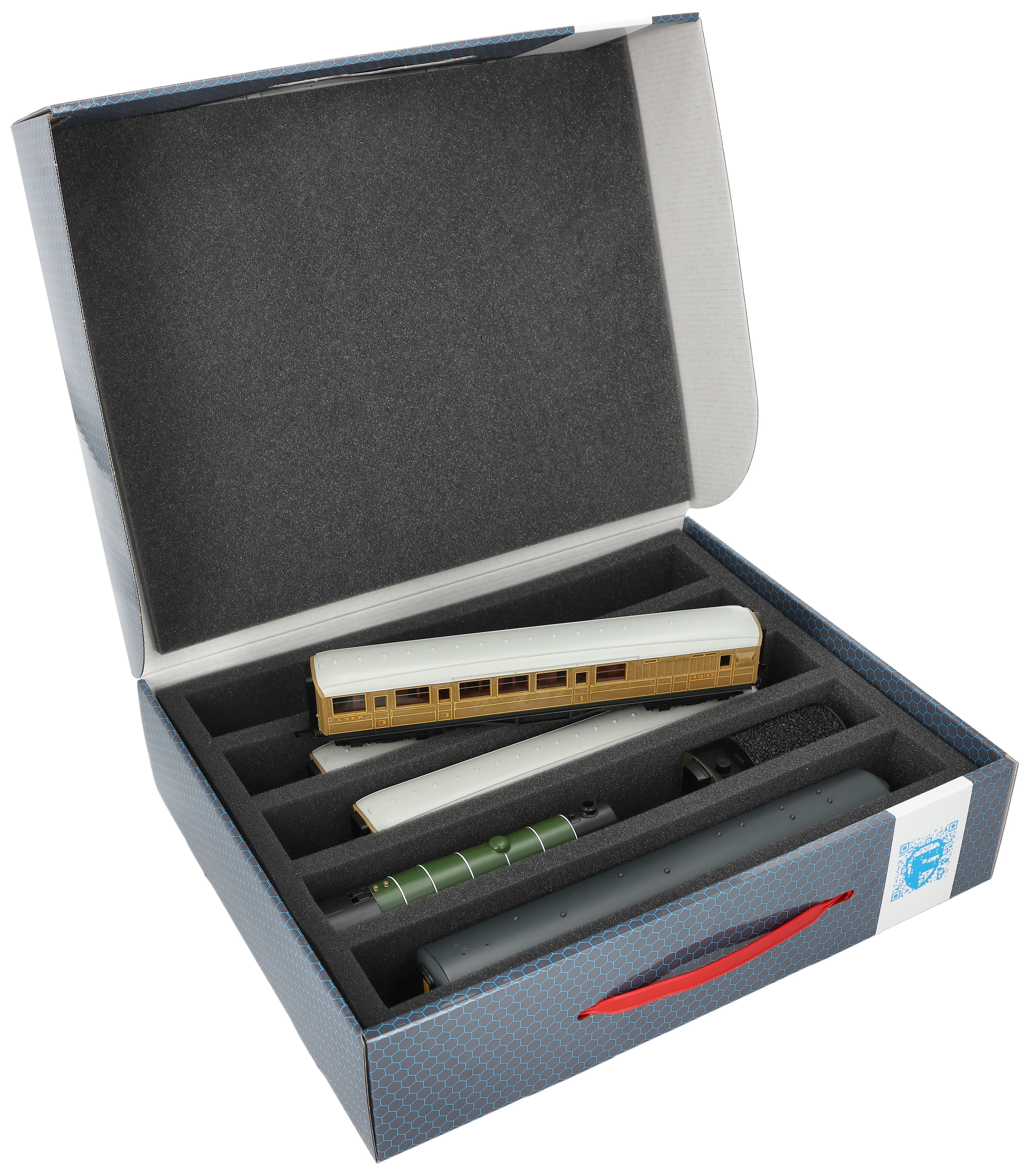 Several trains and carriages can be stored next to each other in one compartment. To prevent them from colliding or accidentally coupling, we offer suitable foam spacers (HS040A002, HS020A001).