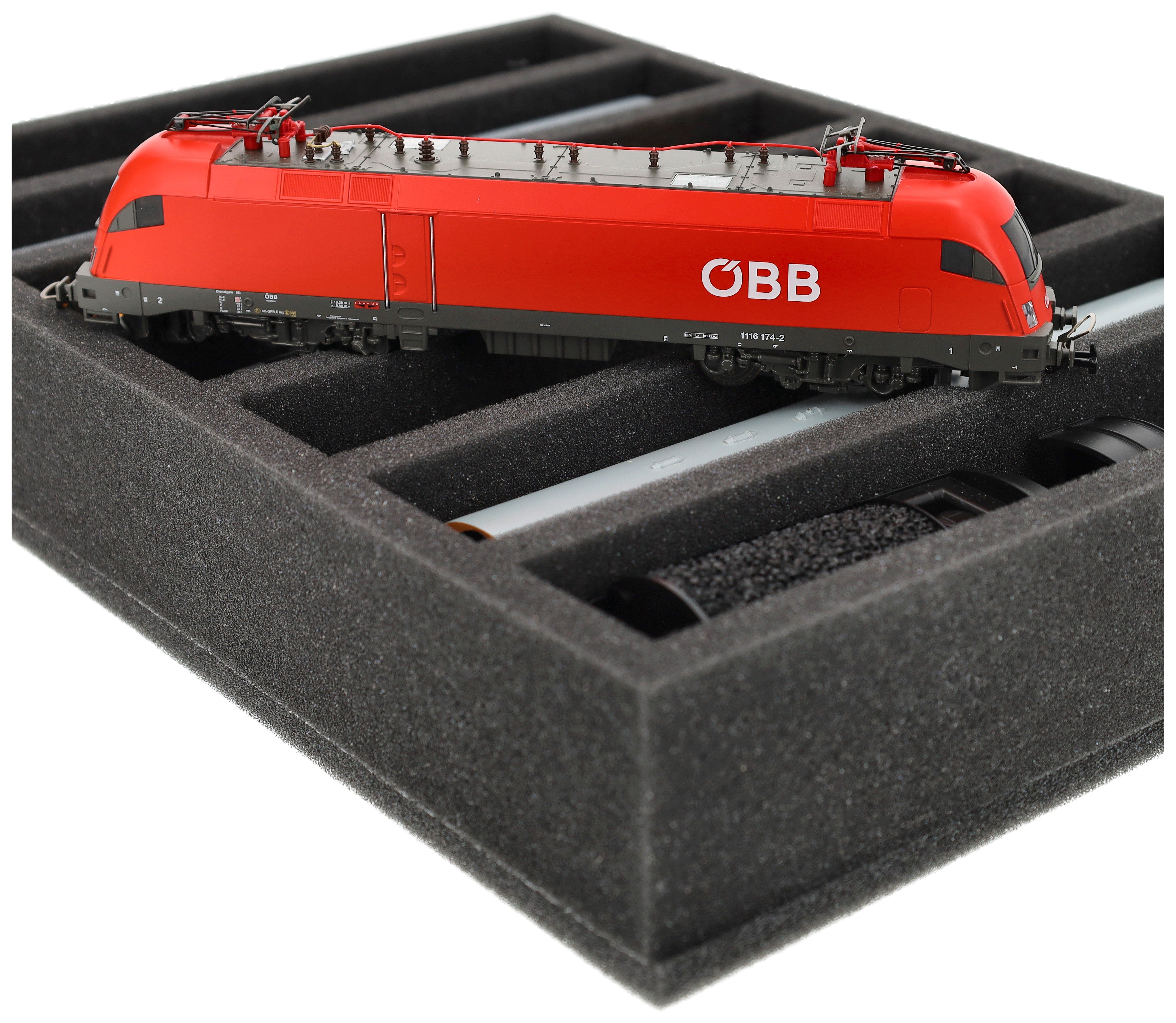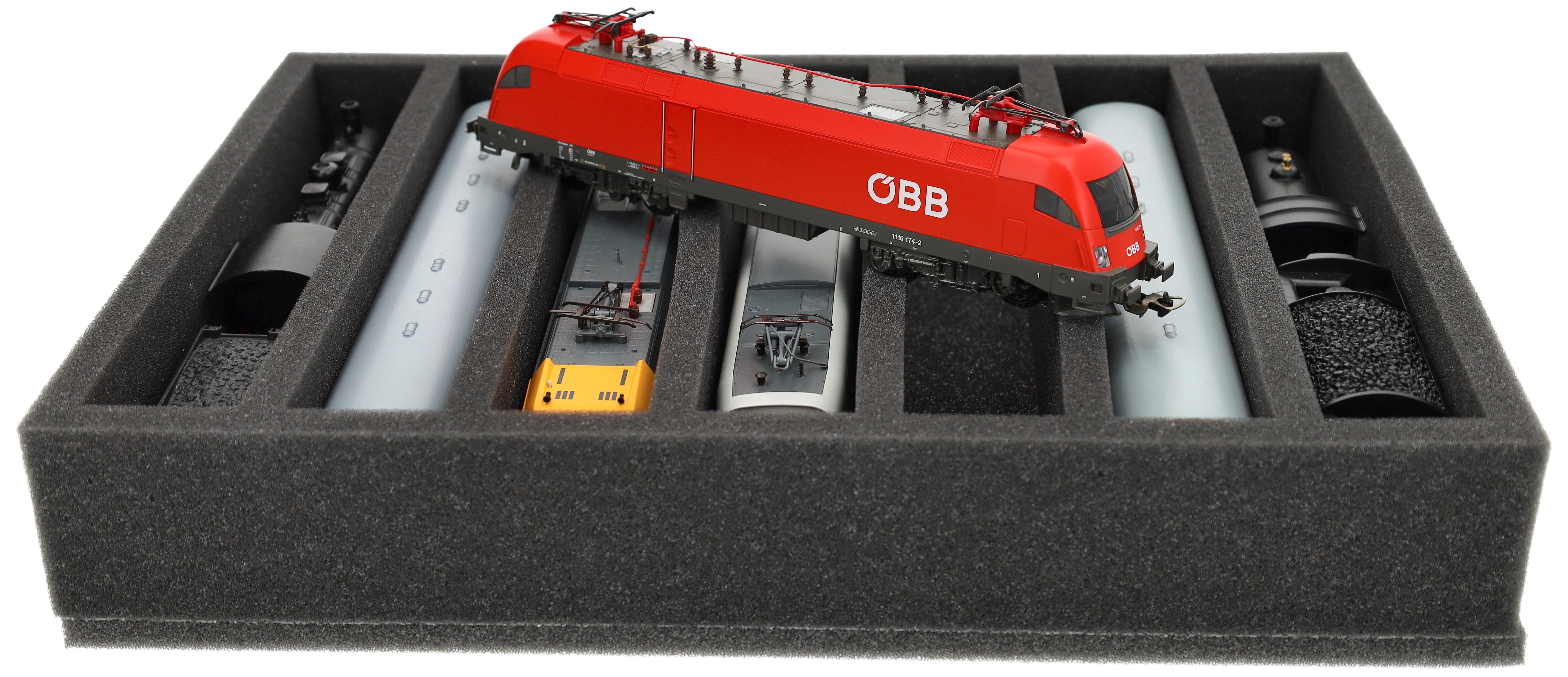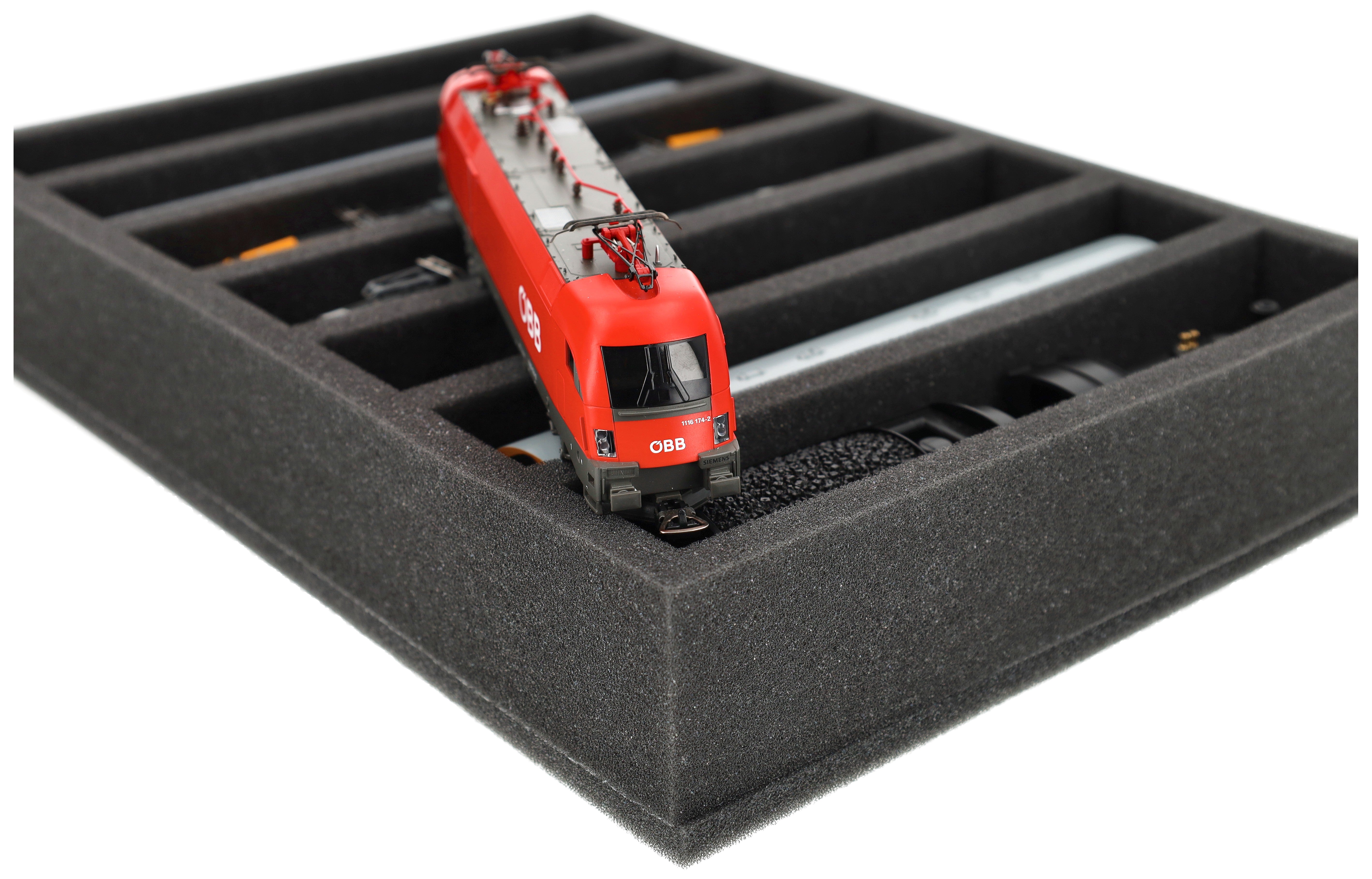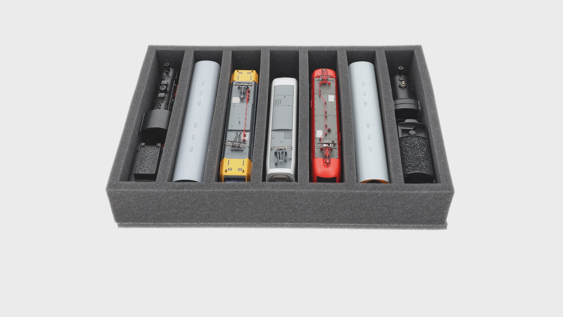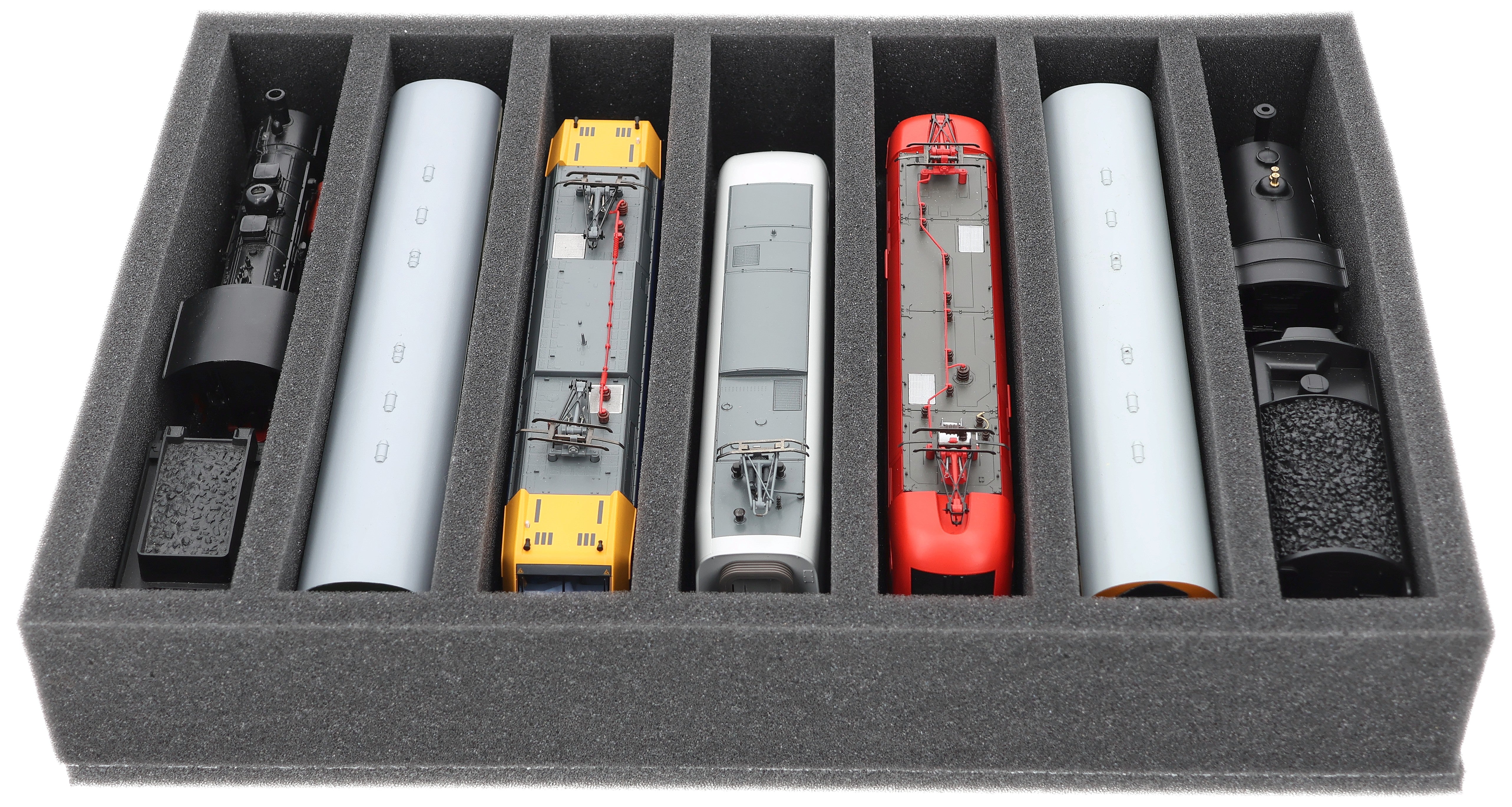 Whether for transport to exhibitions, module meetings, or safe storage on shelves at home, this insert keeps your H0 scale locomotives and cars reliably protected. The 7 compartments hold the models upright and shield them from bumps and scratches.