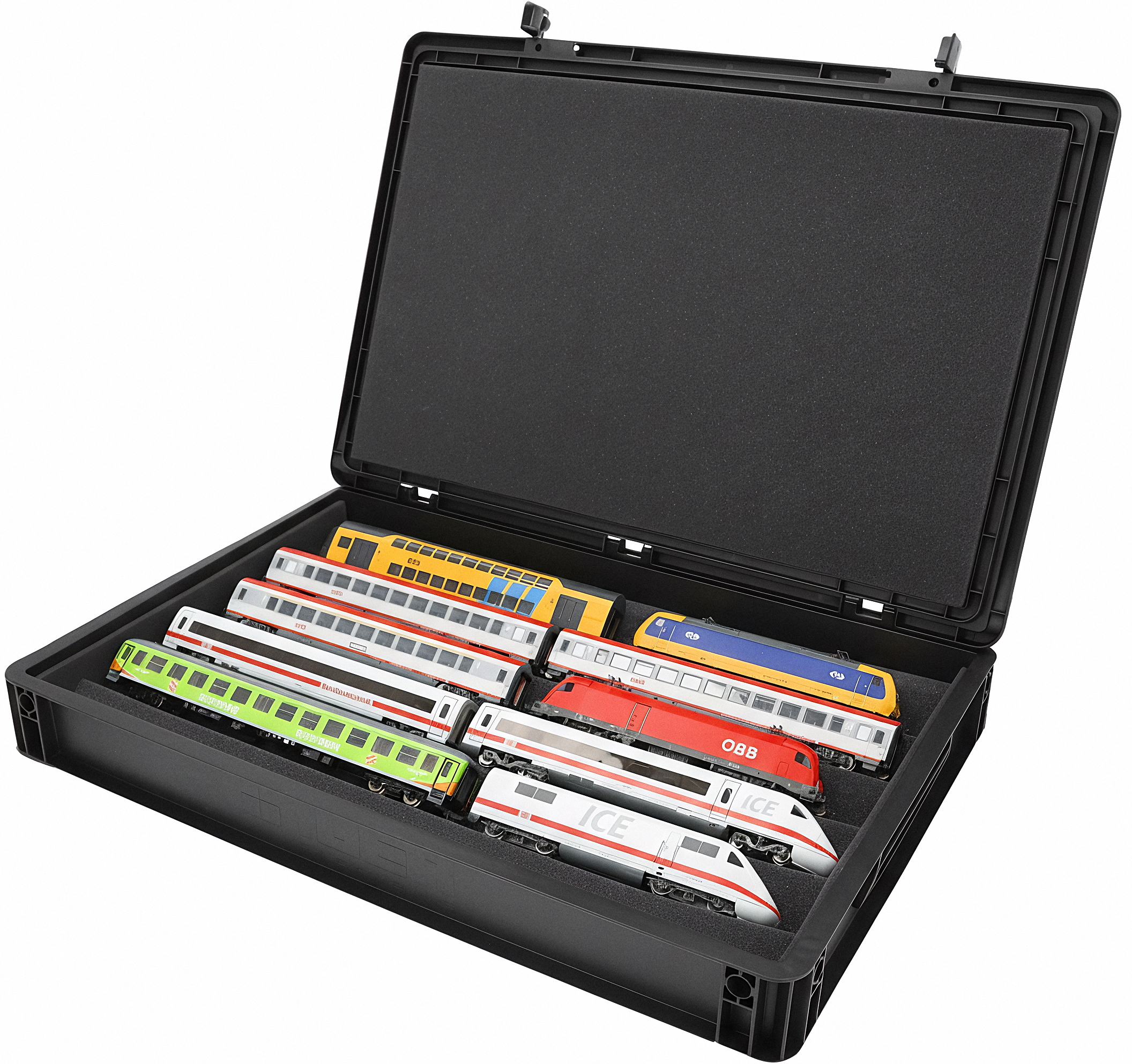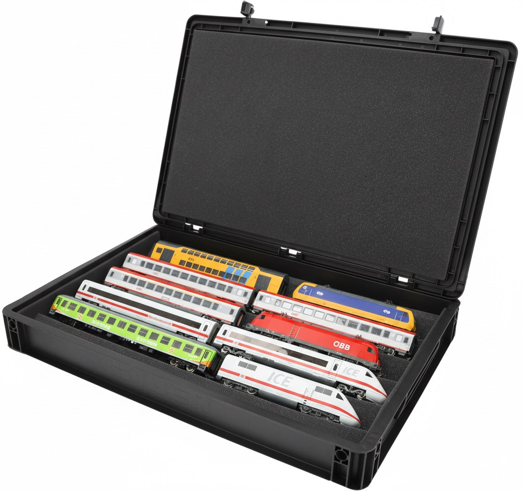 Neatly stored, attractively displayed and safely transported – The flexible foam insert for model railways in H0 scale in the sturdy Eurobox.