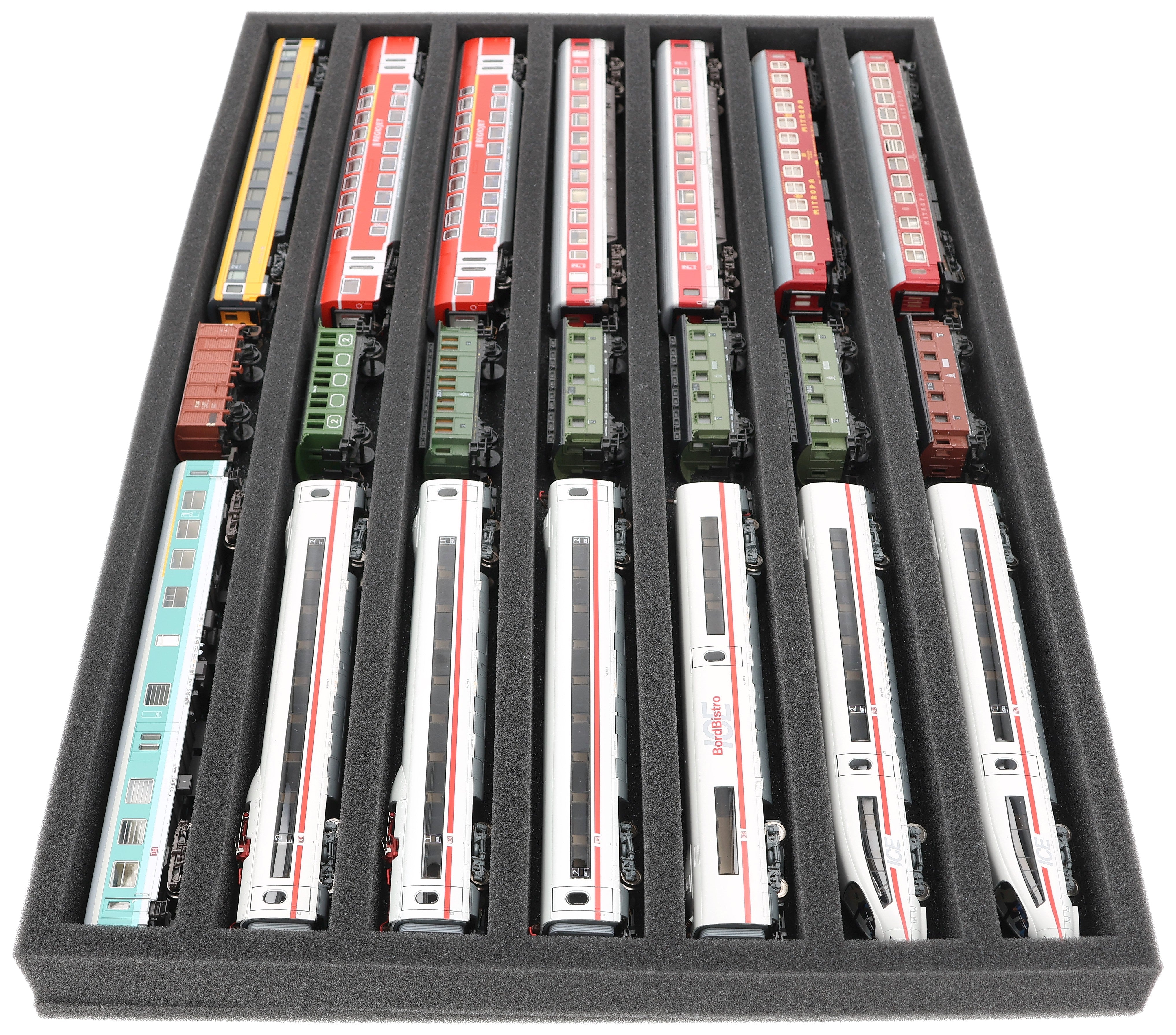 Whether for transport to exhibitions, module meetings, or safe storage on shelves at home, this insert keeps your TT scale locomotives and cars reliably protected. The 7 compartments hold the models horizontal and shield them from bumps and scratches.