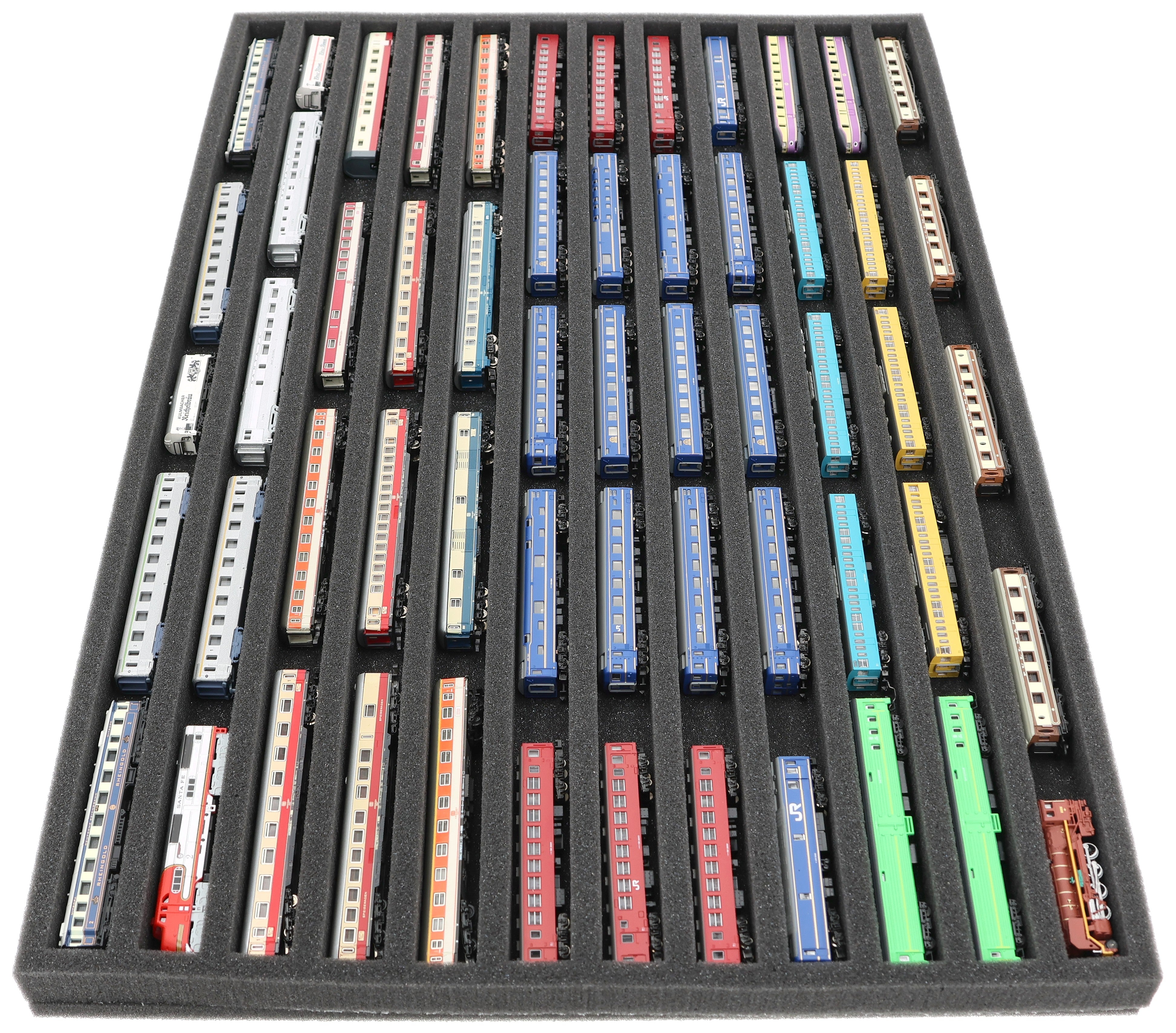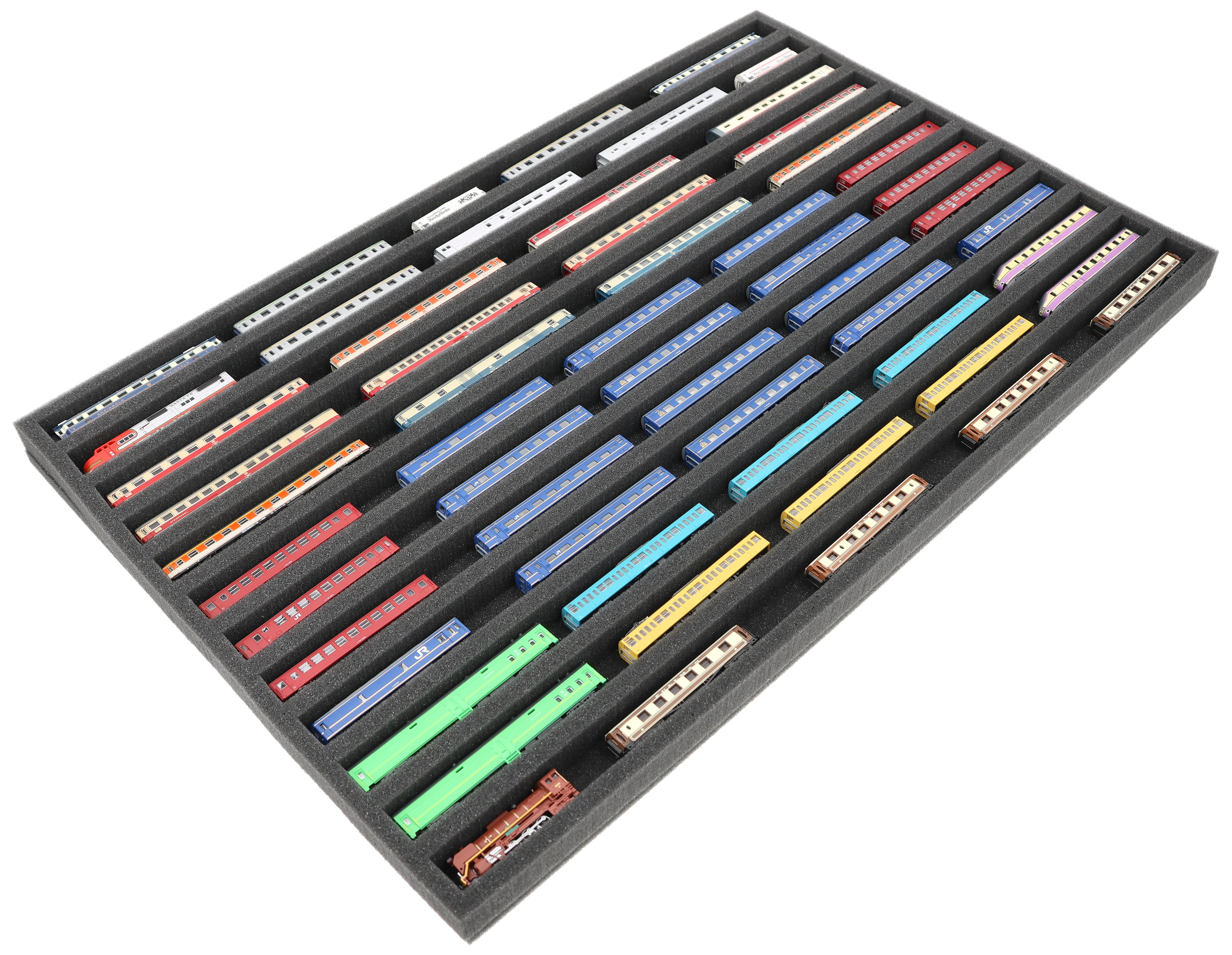 Whether for transport to exhibitions, module meetings, or safe storage on shelves at home, this insert keeps your Z scale locomotives and cars reliably protected. The 12 compartments hold the models horizontally and shield them from bumps and scratches.