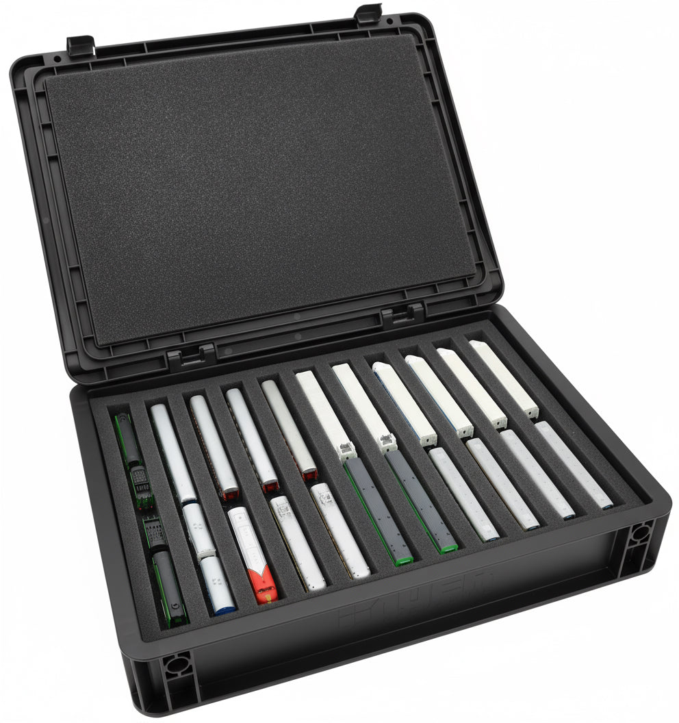The 11 equal-sized compartments (each approx. 245 x 20 x 20 mm) are specially designed for Z scale models. Depending on their length, several wagons or locomotives can be placed side by side. The exact fit ensures that the models are securely fixed and do not slip during transport.