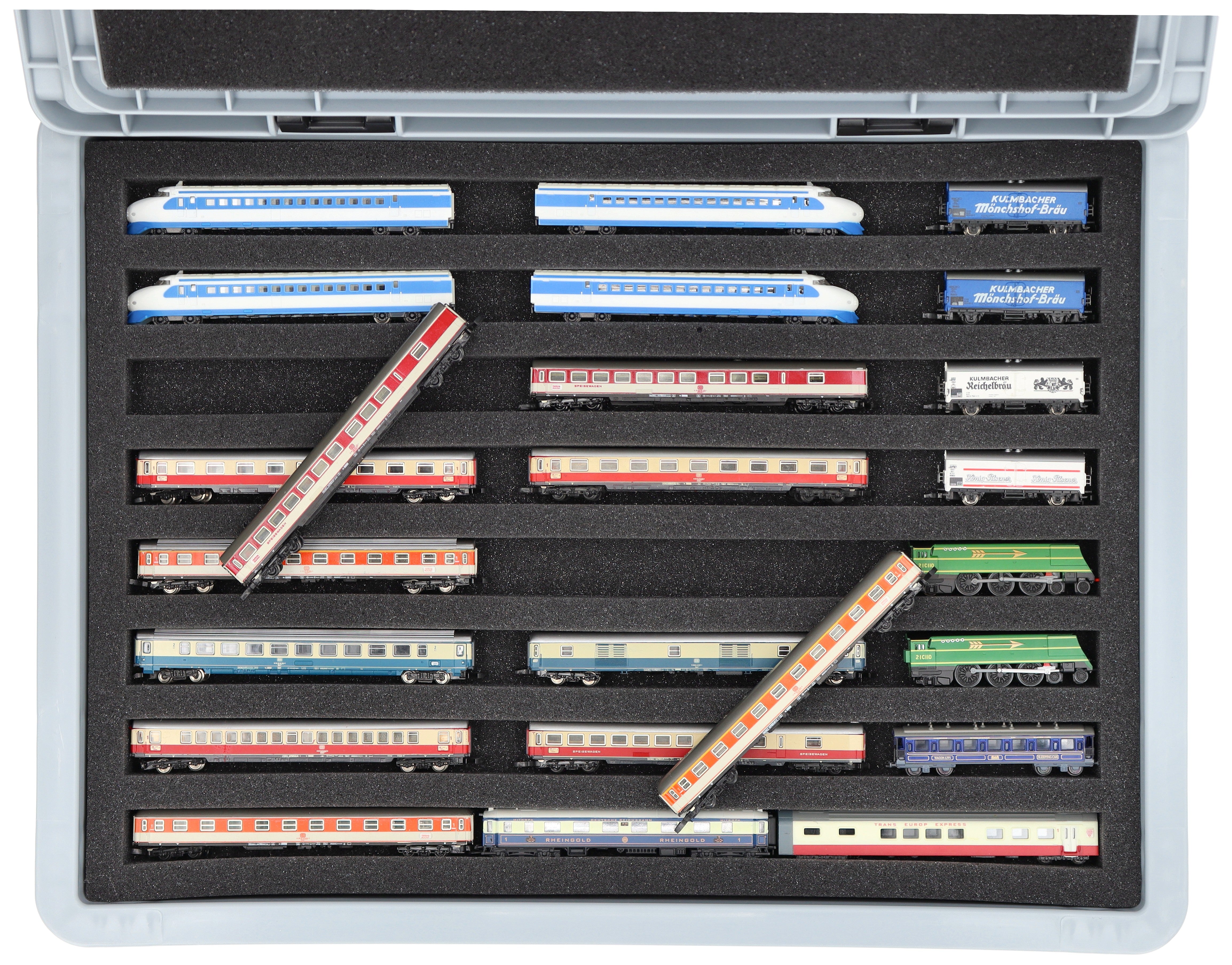 The 8 equal-sized compartments (each approx. 340 x 20 x 20 mm) are specially designed for Z scale models. Depending on their length, several wagons or locomotives can be placed side by side. The exact fit ensures that the models are securely fixed and do not slip during transport.